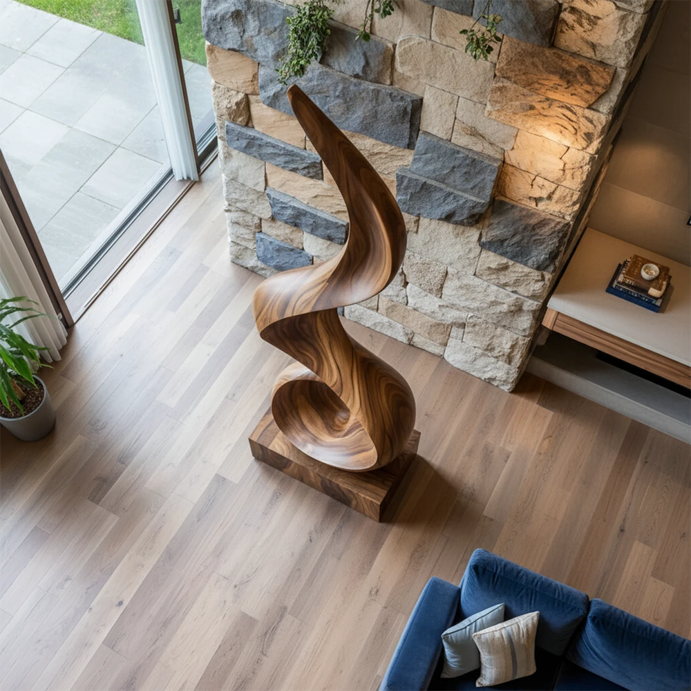 The ascending double-twist design delivers a bold yet graceful statement, serving beautifully as a standalone art feature for spacious living rooms, entry halls, or gallery environments. Its balanced geometry makes it ideal for collectors looking for natural wood abstract sculpture, modern wood art, or handcrafted statement pieces to anchor a refined interior.