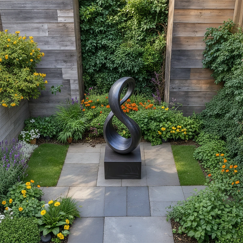 This abstract infinity sculpture embodies fluidity, balance, and continuous motion. Its sweeping curves create a rhythmic visual flow that elevates any interior or gallery-style space. The form expresses harmony and timeless artistry, making it a striking centerpiece for modern homes.