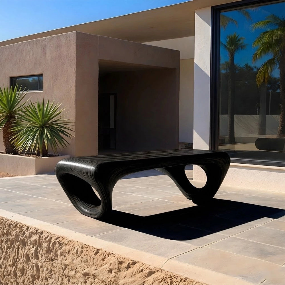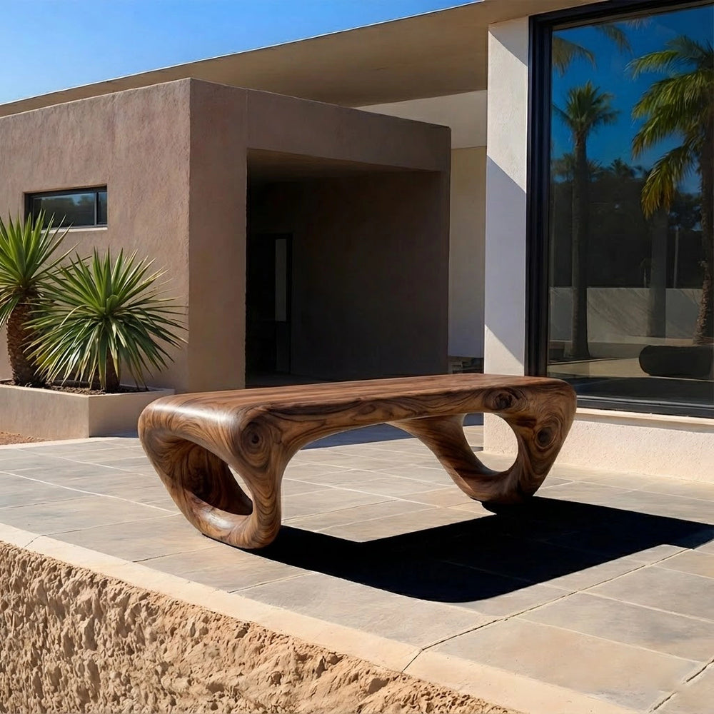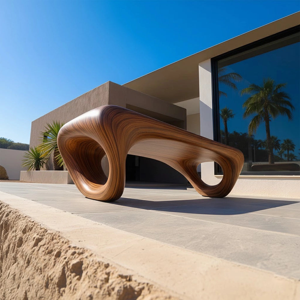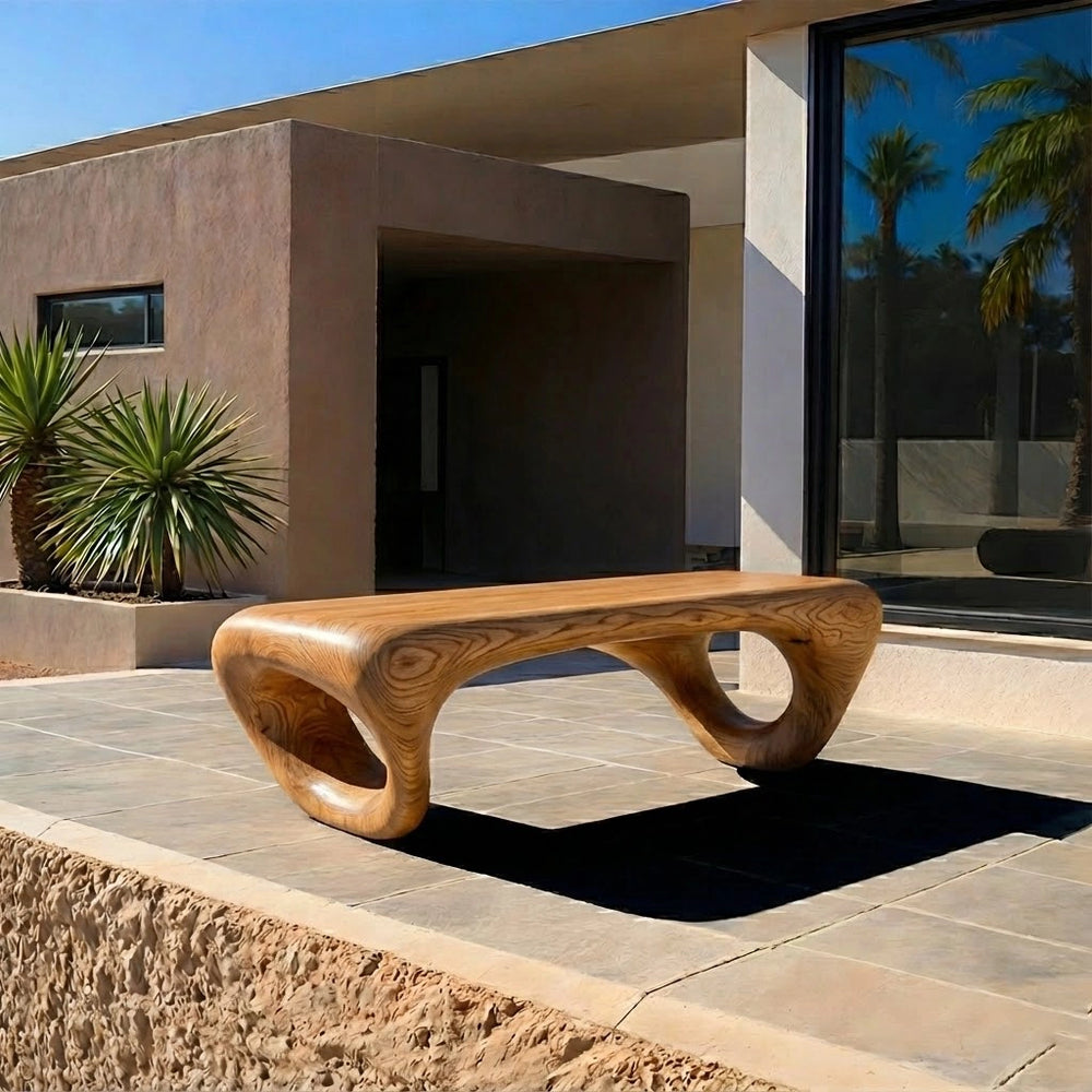 Hand-formed from Natural Solid Wood, this sculptural bench reveals an elegant looped silhouette that feels both fluid and architectural. Its continuous curves and open circular forms create a striking focal point—balancing organic warmth with bold contemporary artistry.