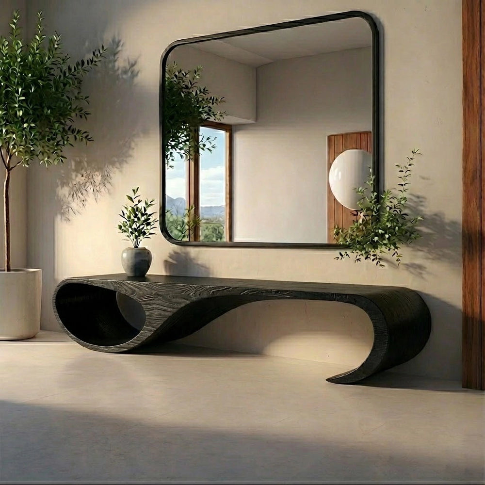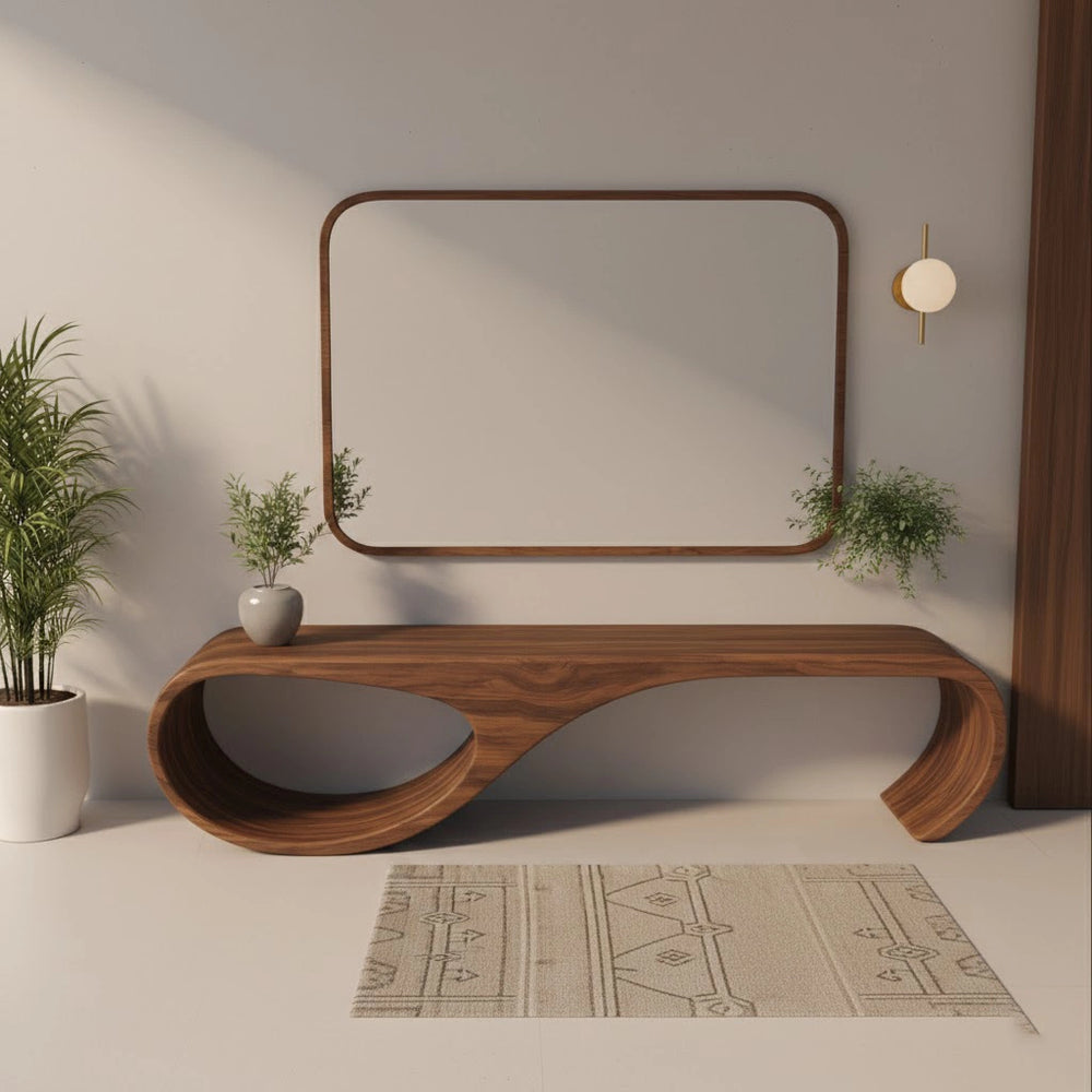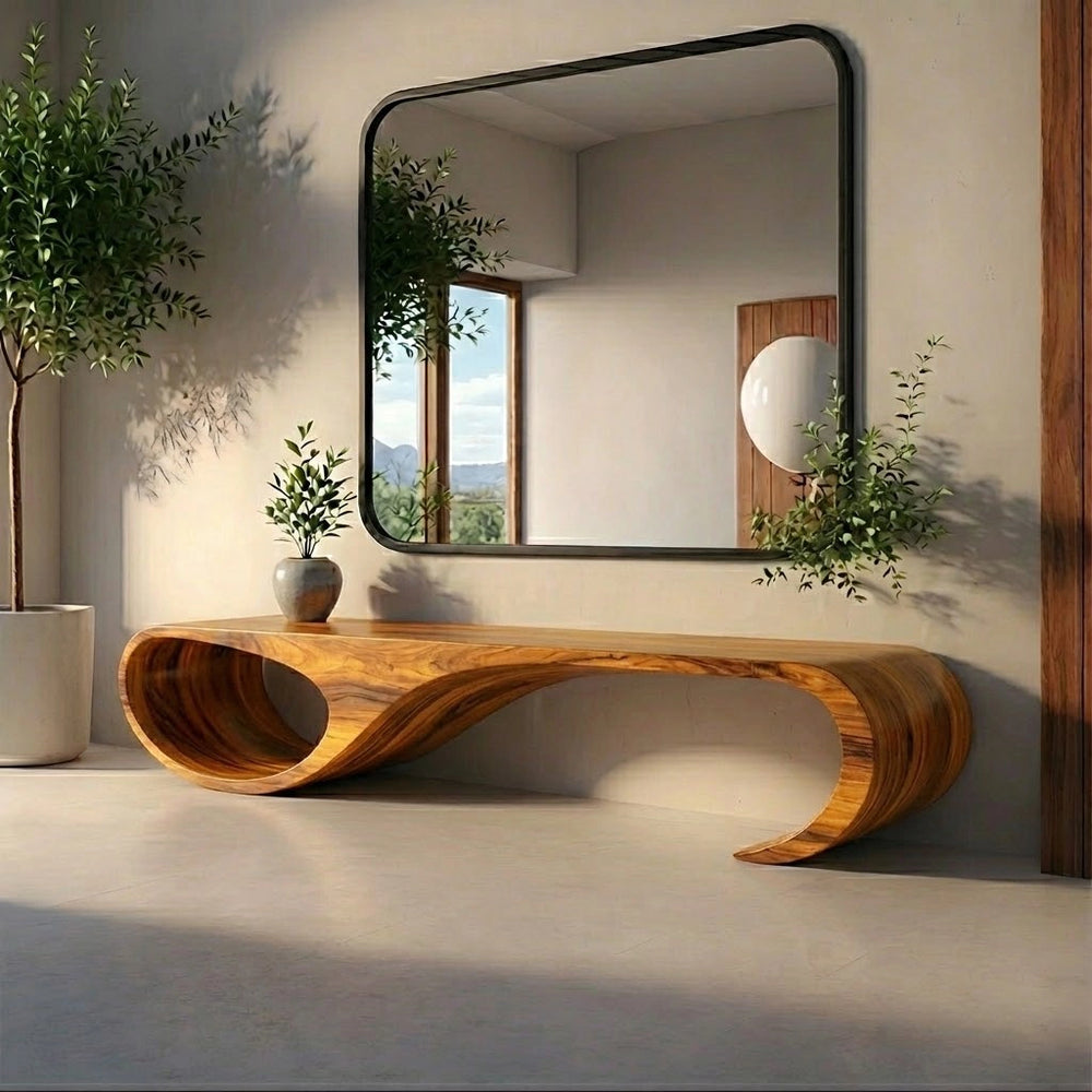 Formed entirely from Natural Solid Wood, this bench flows like a single continuous wave—its sweeping curves and open, carved interior creating a serene architectural presence. The piece stands as a celebration of natural movement, craftsmanship, and sculptural elegance.