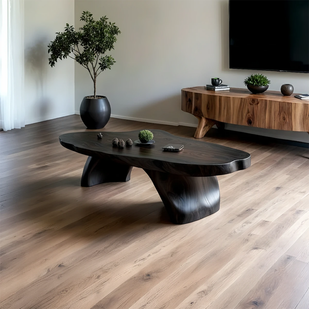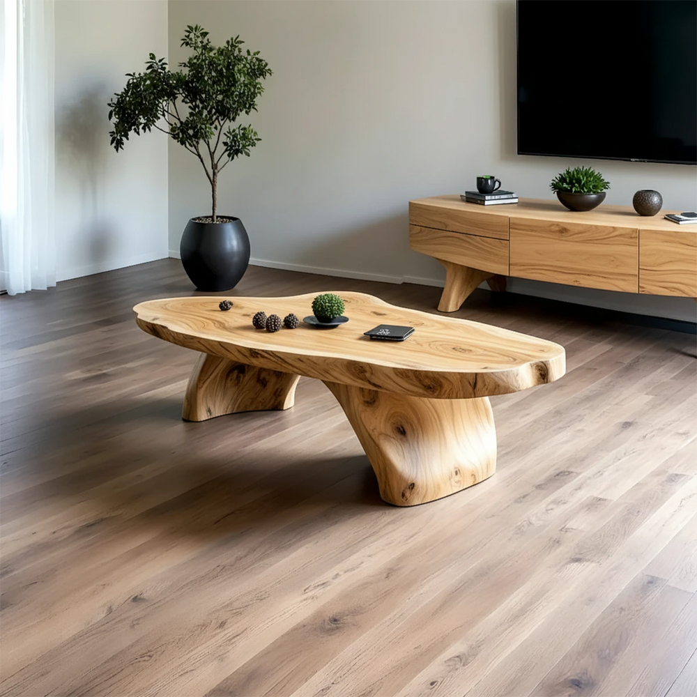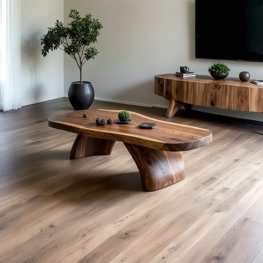The table features a wide, organically contoured top supported by sculpted legs that enhance both visual balance and structural integrity. Its flowing form creates a harmonious focal point suitable for contemporary living spaces while providing a practical surface for everyday use. The combination of live-edge curves and clean lines aligns beautifully with trending styles like minimalist wood table, raw wood furniture, and solid wood coffee table aesthetics.