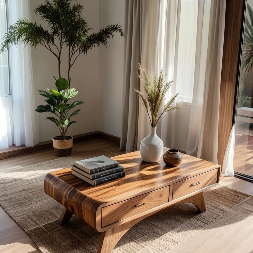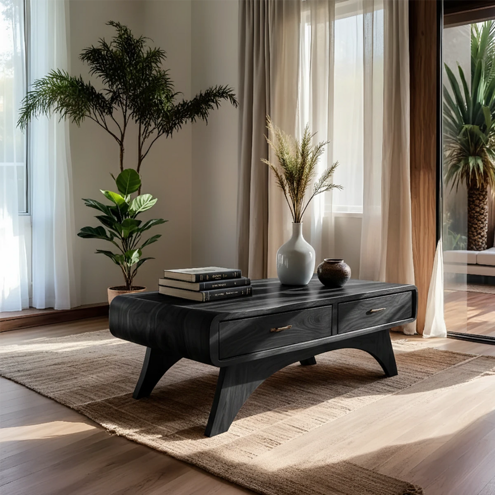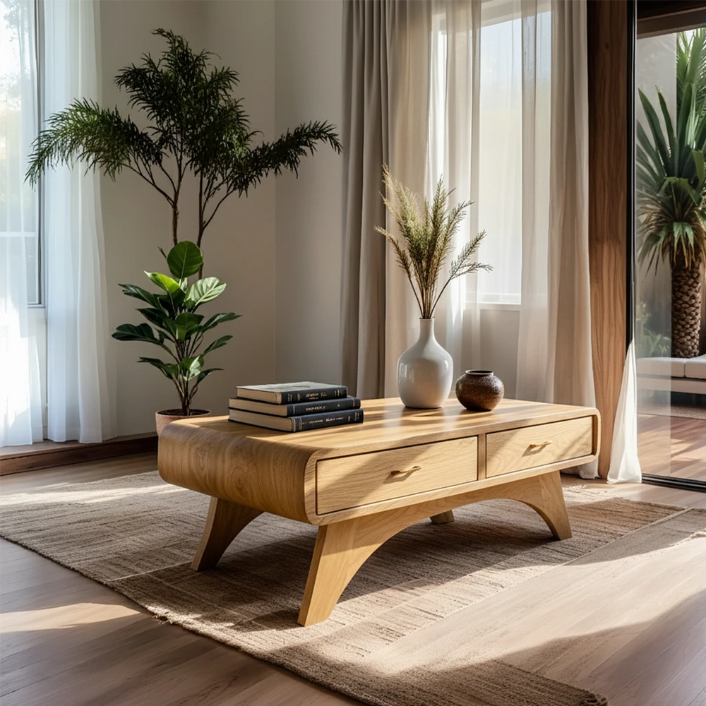 The softly arched legs elevate the table with a light, sculptural presence, while two built-in drawers provide discreet, practical storage. Its low, modern profile complements minimalist coffee table and mid-century wood table aesthetics, making it a functional yet artistic centerpiece for any living room.