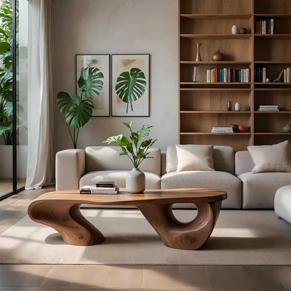 This coffee table is handcrafted from Natural Solid Wood, shaped into flowing organic curves that highlight the natural beauty of authentic grain patterns. Each sweeping line is carved to reveal the inherent depth, warmth, and texture of real wood, creating a distinctive sculptural centerpiece for modern living spaces.