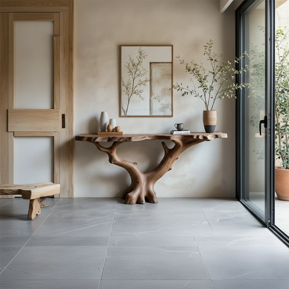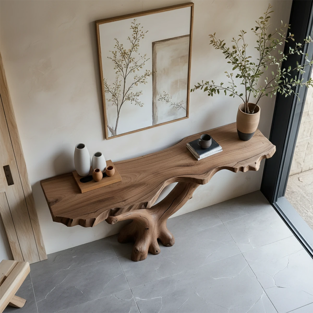 Hand-carved from Natural Solid Wood, this console evokes the quiet strength of a living branch reaching outward into space. The tabletop preserves natural edge contours, while the branching pedestal rises with fluid, tree-like motion. It brings a grounding calmness to entryways, living rooms, and curated spaces where craftsmanship and nature coexist beautifully.