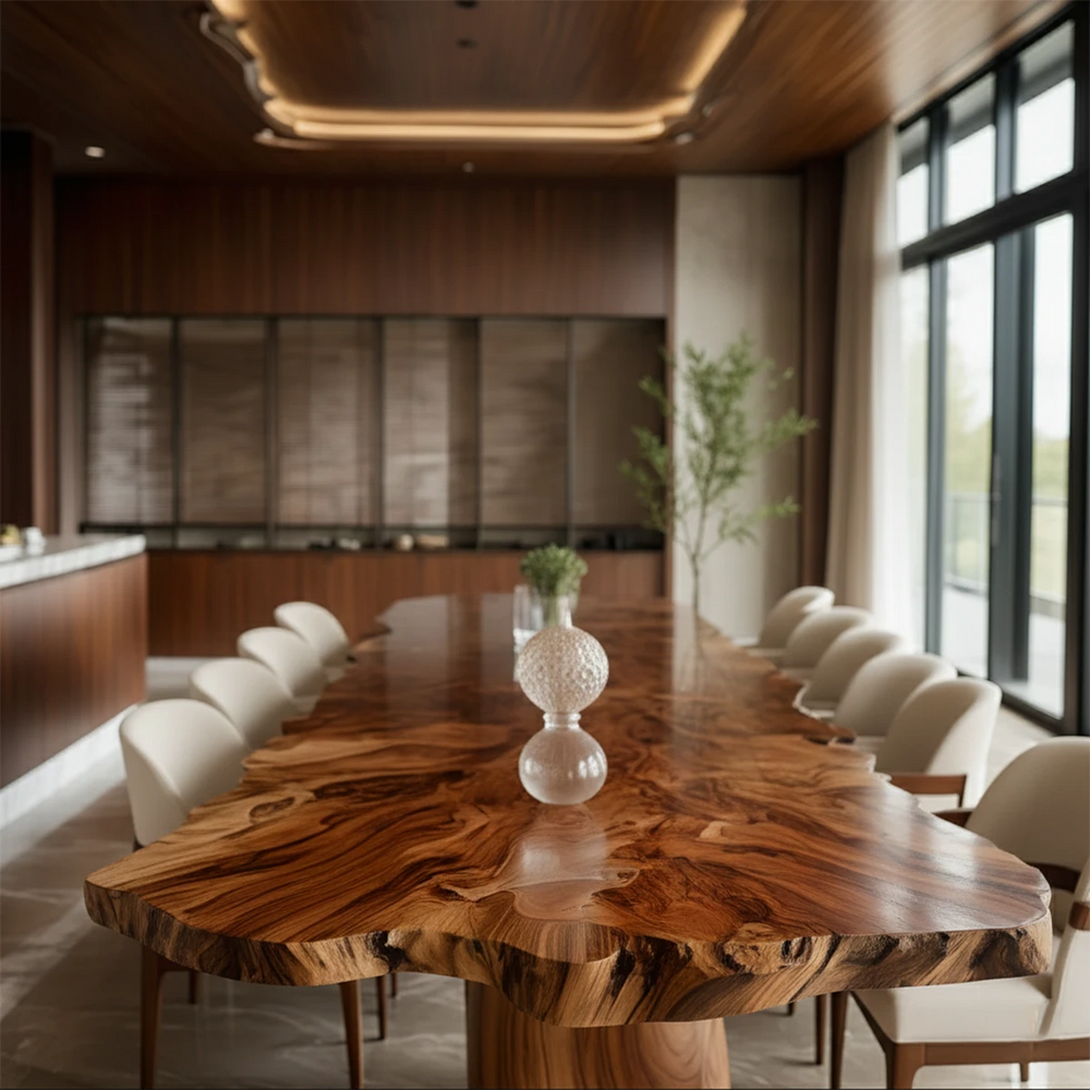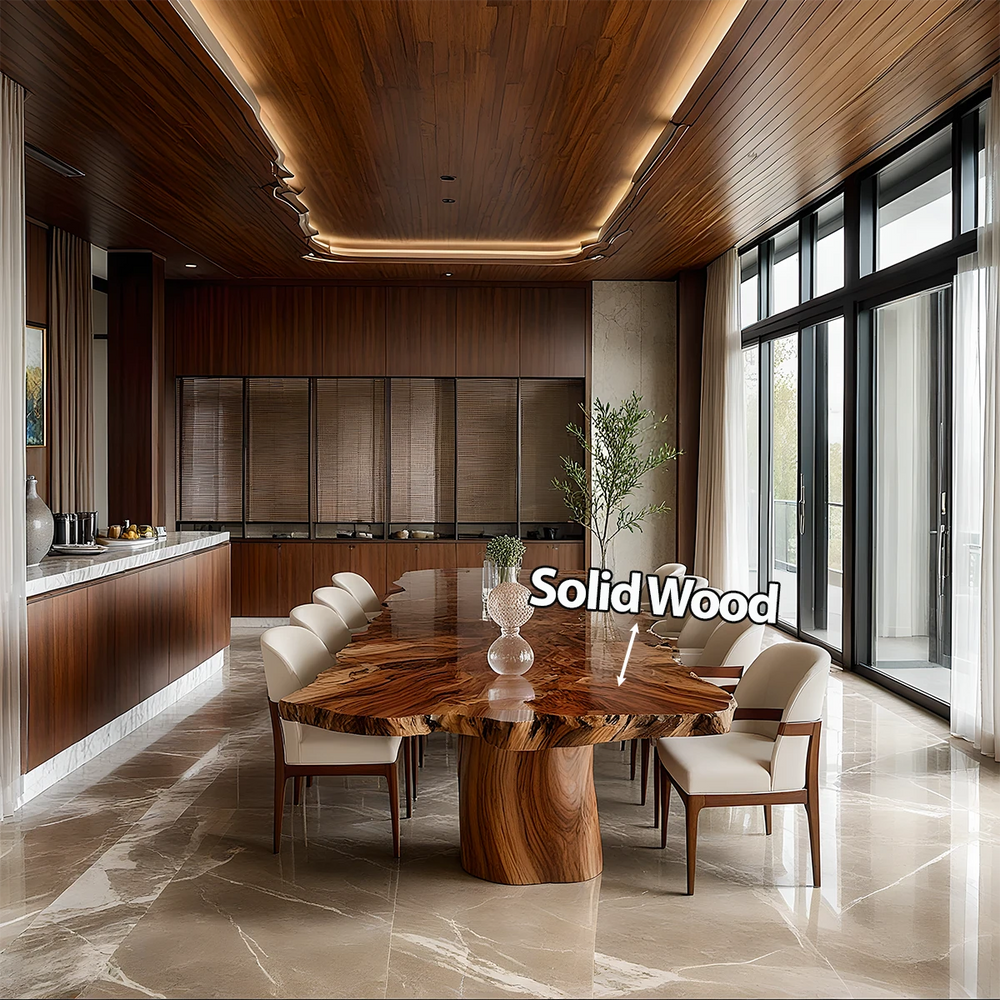 Carved from expansive slabs of Natural Solid Wood, this Modern Luxury dining table commands the room with its bold silhouette and shimmering grain patterns. The surface appears almost fluid under the light—rich, warm, and alive with movement—creating an atmosphere of refinement that transforms any dining space into a place of quiet grandeur.