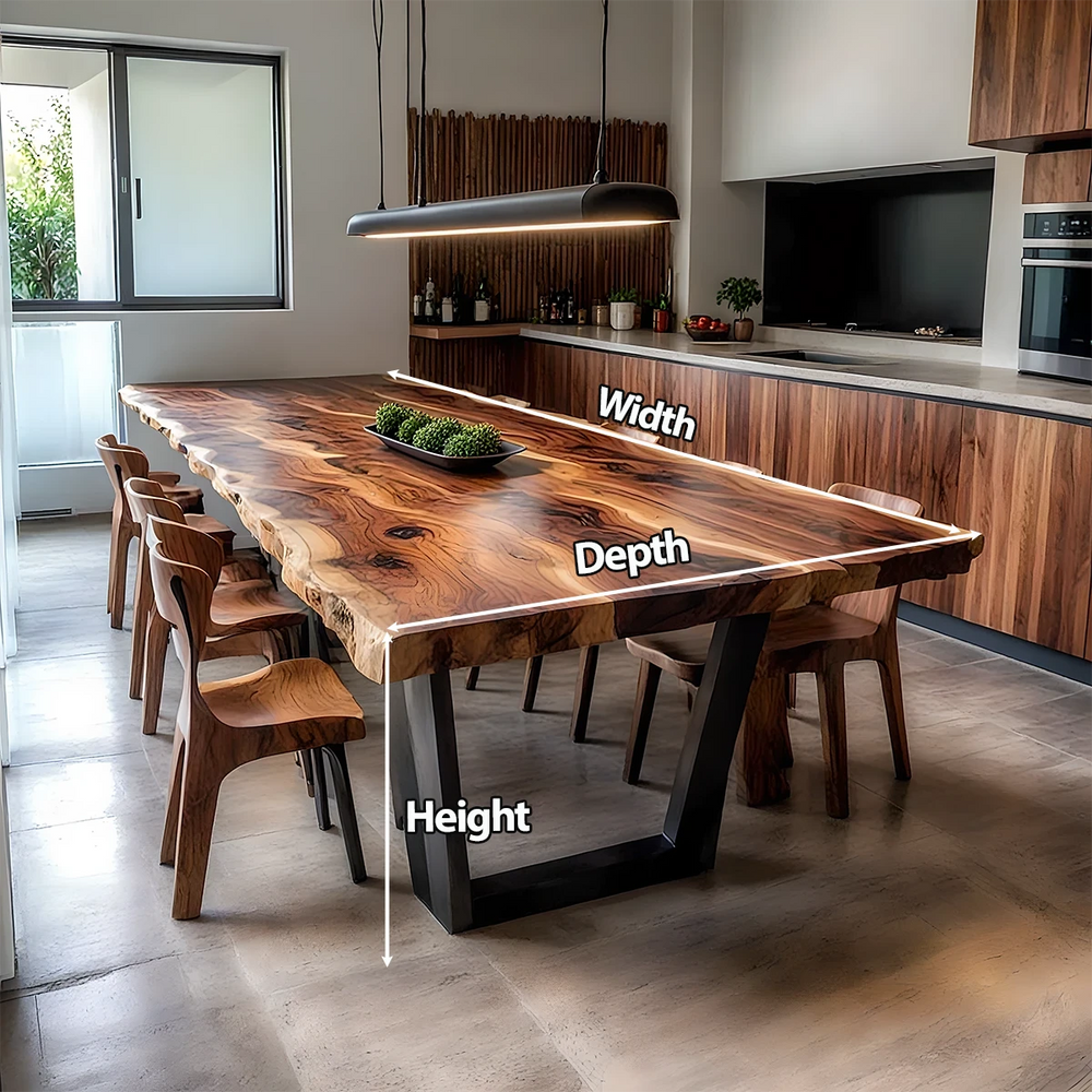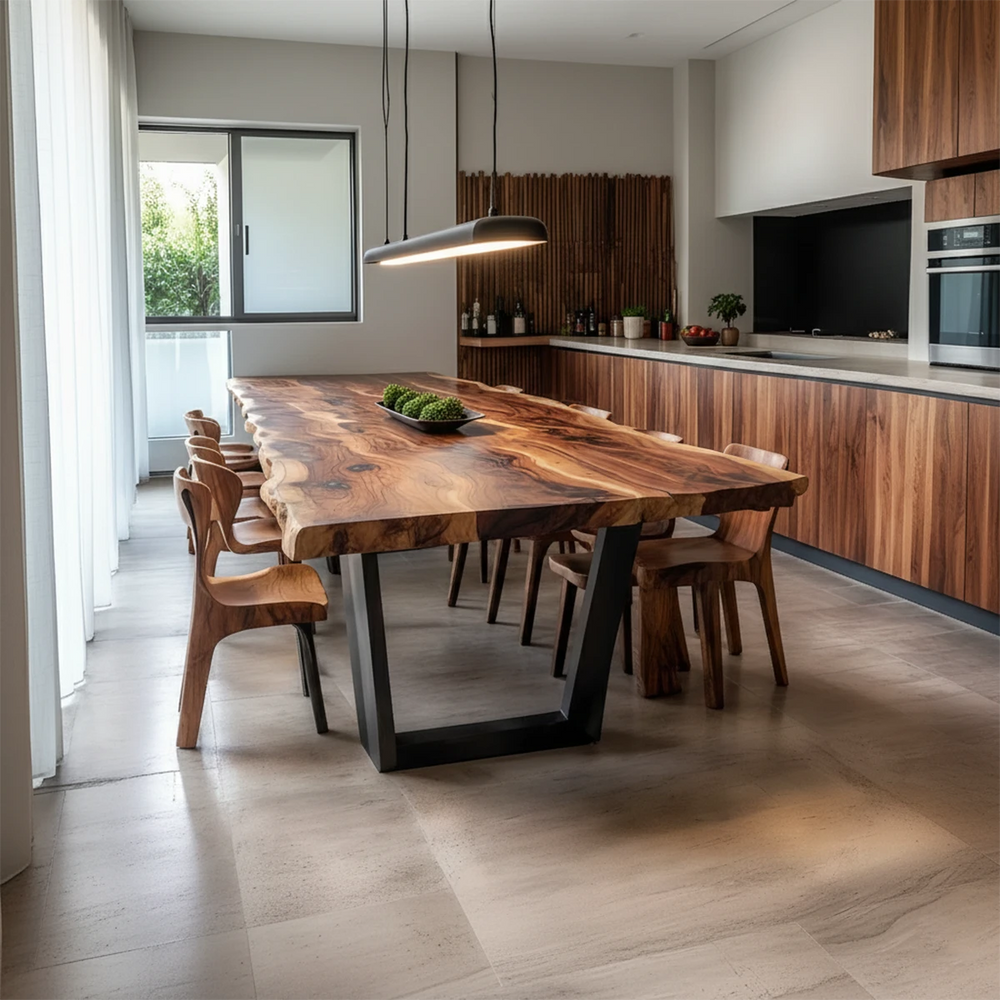 The live-edge top sits gracefully on a strong geometric metal base, creating a modern contrast that enhances both structure and elegance. This sculptural interplay elevates dining spaces in Modern, Rustic Luxury, Scandinavian, and Contemporary homes while maintaining functionality and exceptional stability for daily use.