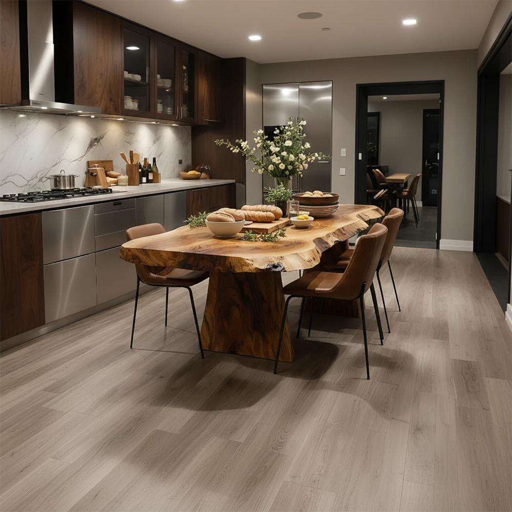 The table transforms mealtime into a sensory ritual—warm tones, natural wood patterns, and soft reflections create a calming, intimate atmosphere. Its presence enhances the rhythm of daily life, offering a space where stories are shared and moments are remembered.