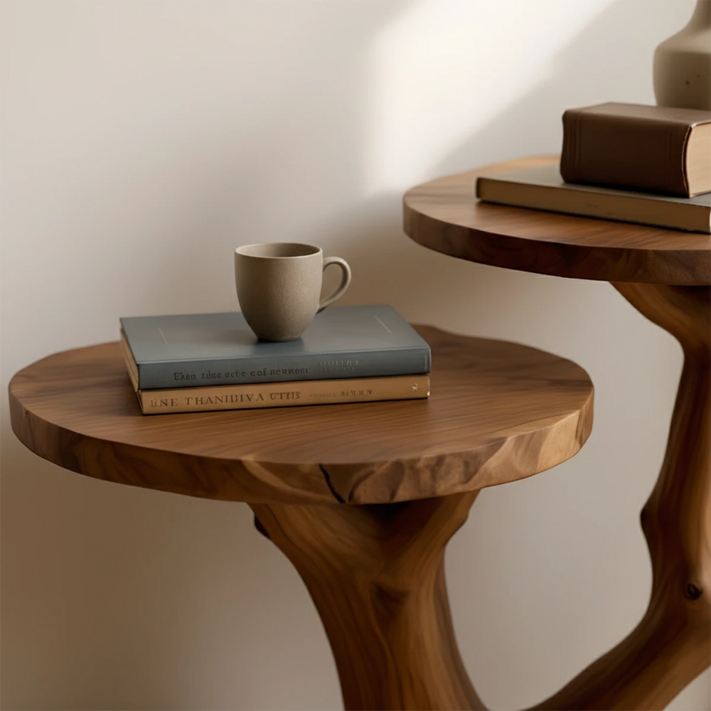 The branchform solid wood base extends outward like intertwined limbs, giving rise to two round tabletops set at staggered heights. This flowform wood structure provides visual dynamism while offering multifunctional use: the upper surface for display pieces or tea rituals, and the lower surface for books, small objects, or decorative accents. The curved wood design creates a silhouette that feels alive, graceful, and harmoniously balanced.
