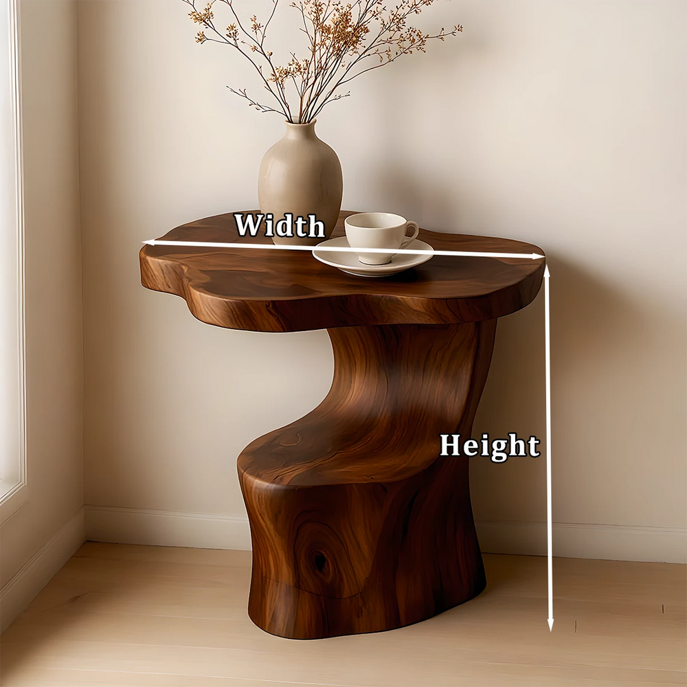 The table’s curved wood design creates a striking silhouette — rising in a flowing motion that supports a tabletop with natural, free-form shaping. This flowform solid wood structure offers both visual poetry and practical utility, serving perfectly as an accent table, corner table, or entryway feature. It stands as a modern sculptural statement, blending artistry and function in perfect balance.