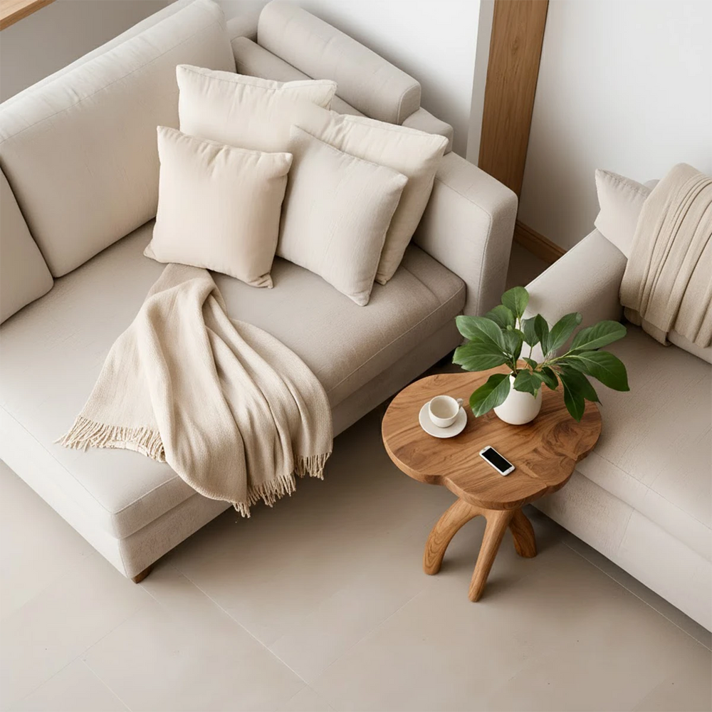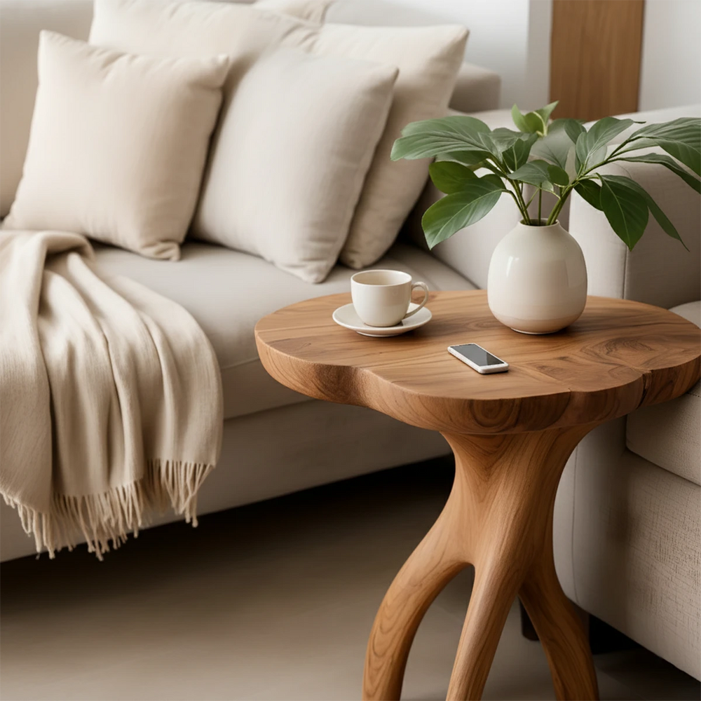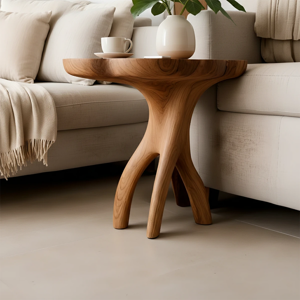 This accent table presents itself as a quiet sculpture — a fluid rise of three elegantly branching legs supporting a beautifully carved round top. Its presence feels calm, refined, and inherently sophisticated. With soft curves, warm tones, and graceful balance, the piece brings a sense of modern serenity to the room, embodying RustiraWood’s vision of elevating natural material into luxury furniture art.
