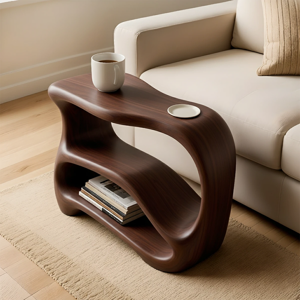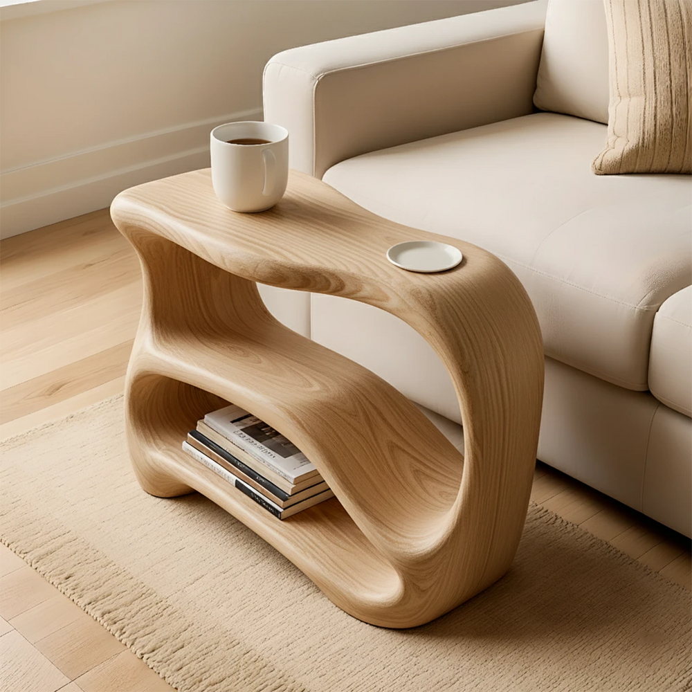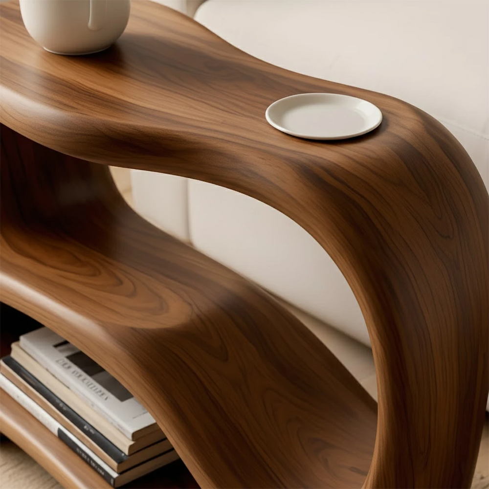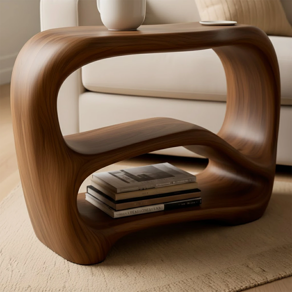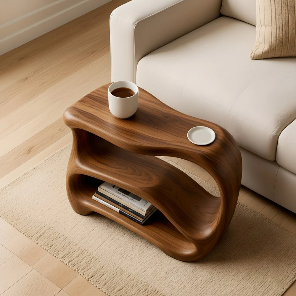 This end table embodies the poetry of fluid movement carved into natural wood. Its soft, undulating silhouette brings a serene elegance to any living space, blending the warmth of nature with the precision of sculptural artistry. The piece radiates calmness — a quiet luxury that feels both grounding and visually uplifting.