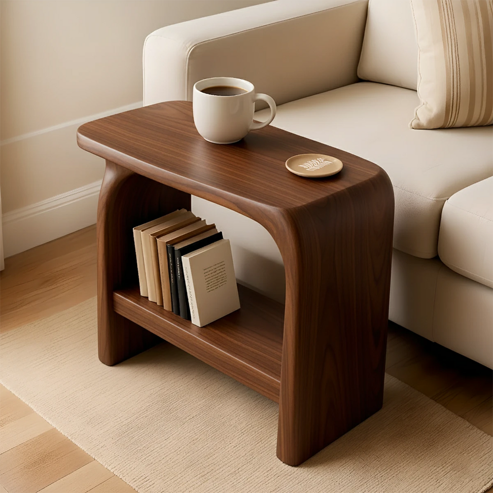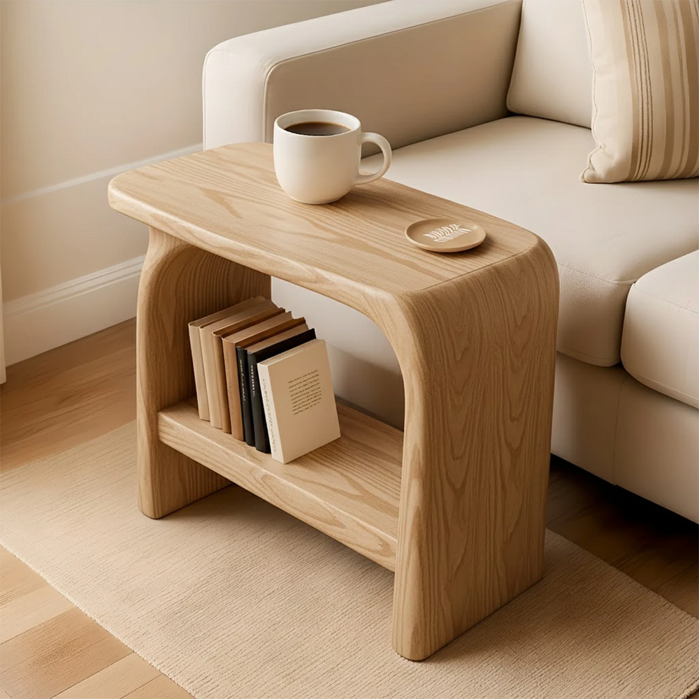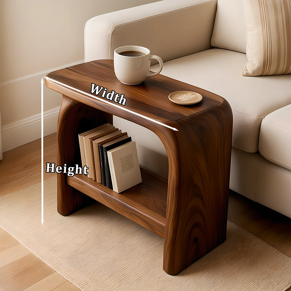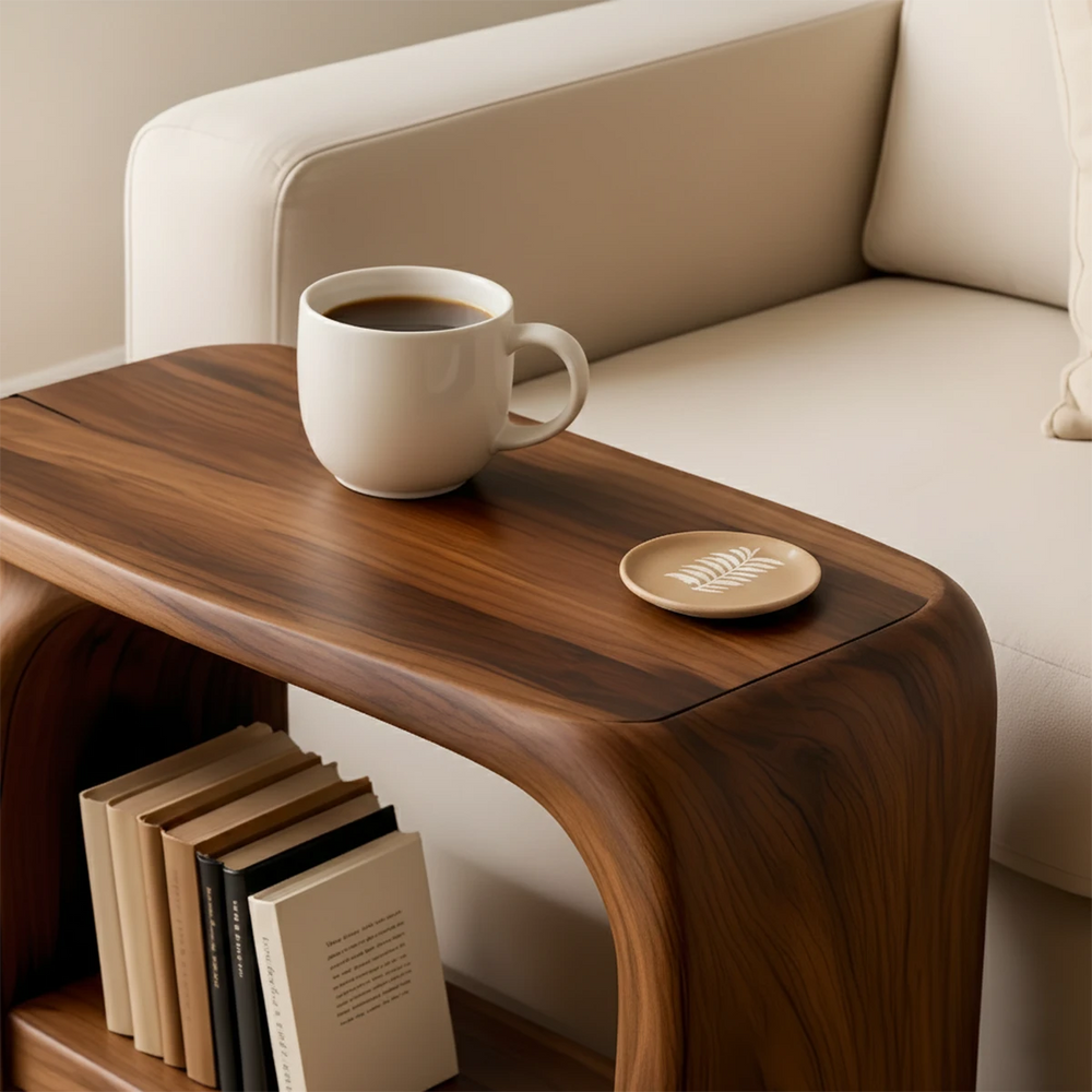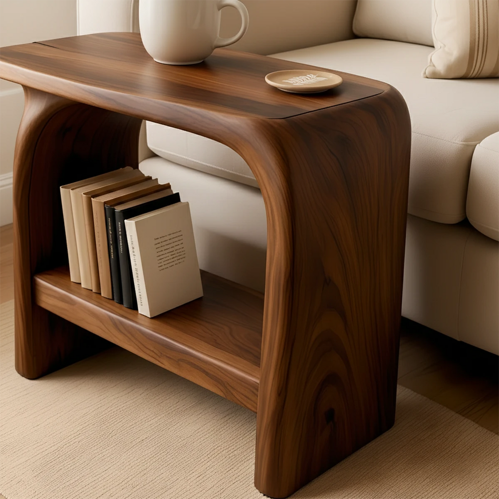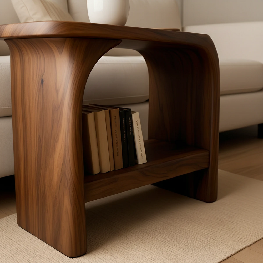 Formed with a Curved Wood Design, this table features a beautifully balanced top supported by gracefully arched legs that flow seamlessly into a stable base. The lower shelf provides functional space for books and essentials, while the upper surface serves daily rituals with elegance. Its flowform solid wood structure makes it both a sculptural accent and a practical companion beside the sofa.