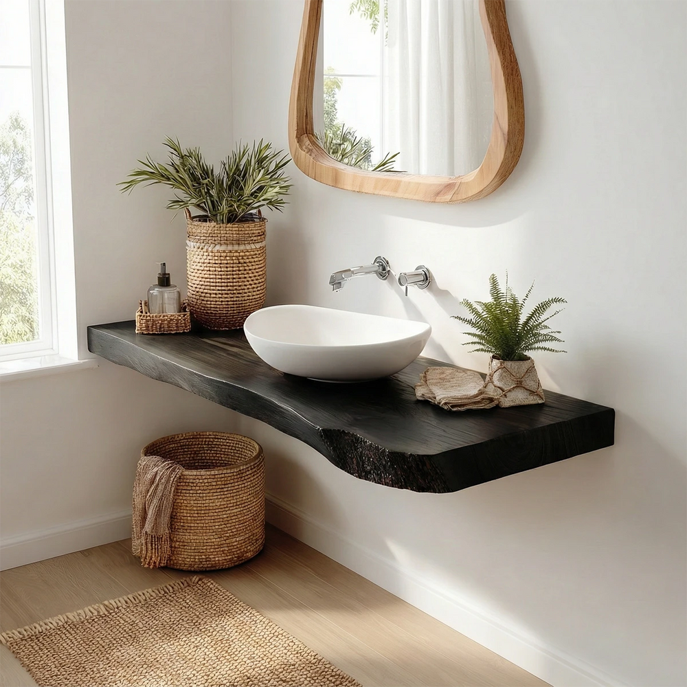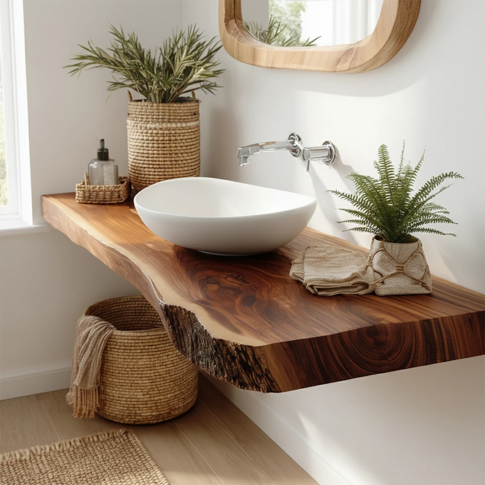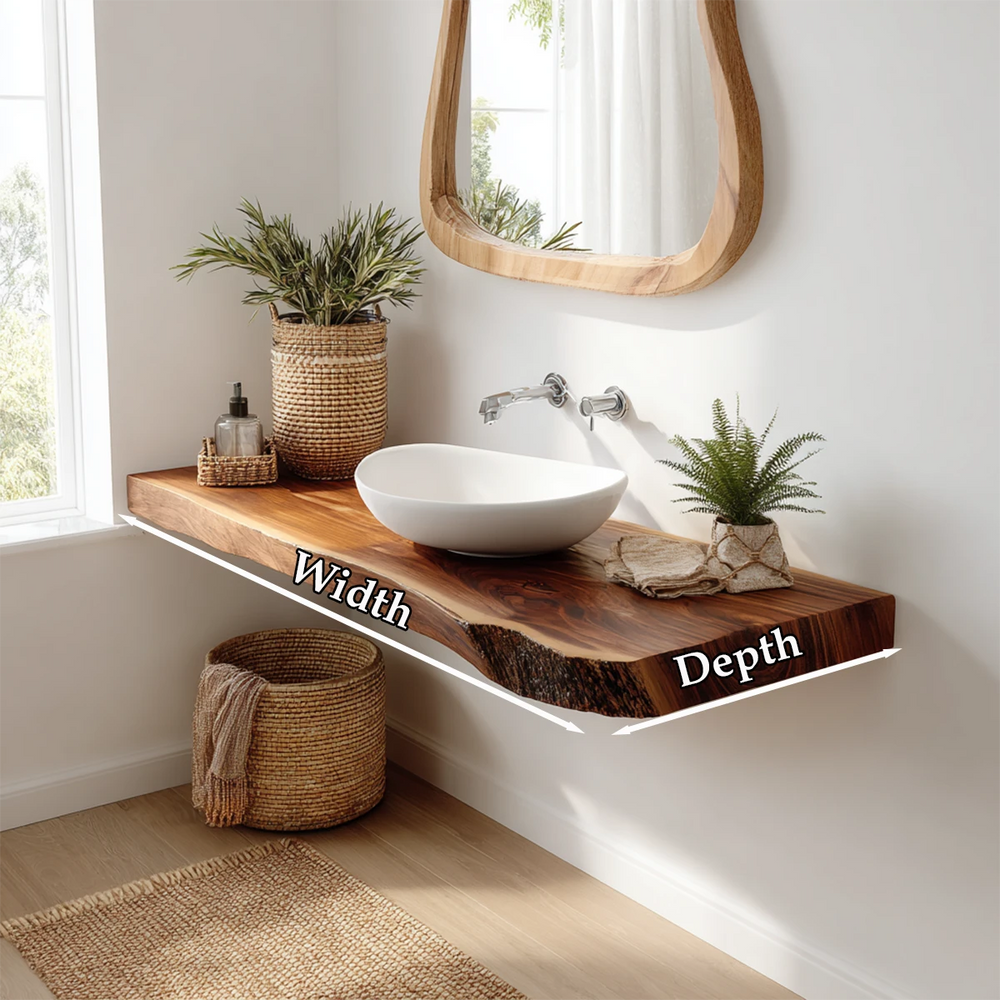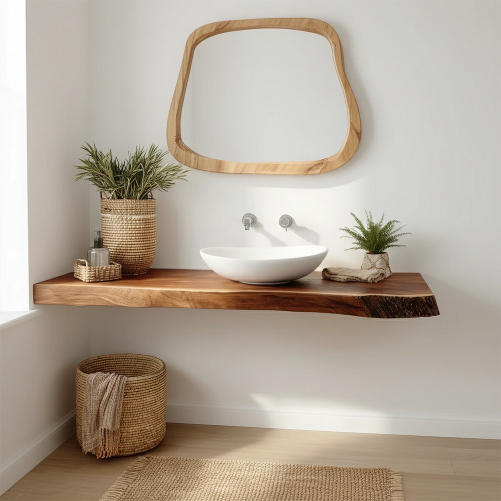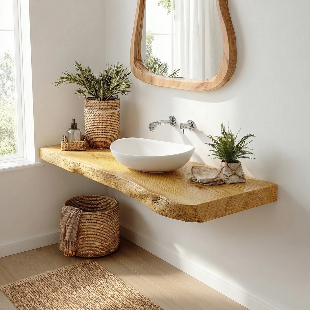 Carved from a single slab of Natural Solid Wood, this floating vanity shelf brings a soft Scandinavian brightness to the bathroom. The sunlight dances across its live edge, revealing gentle curves and warm tones that create an inviting, natural centerpiece for your daily rituals.