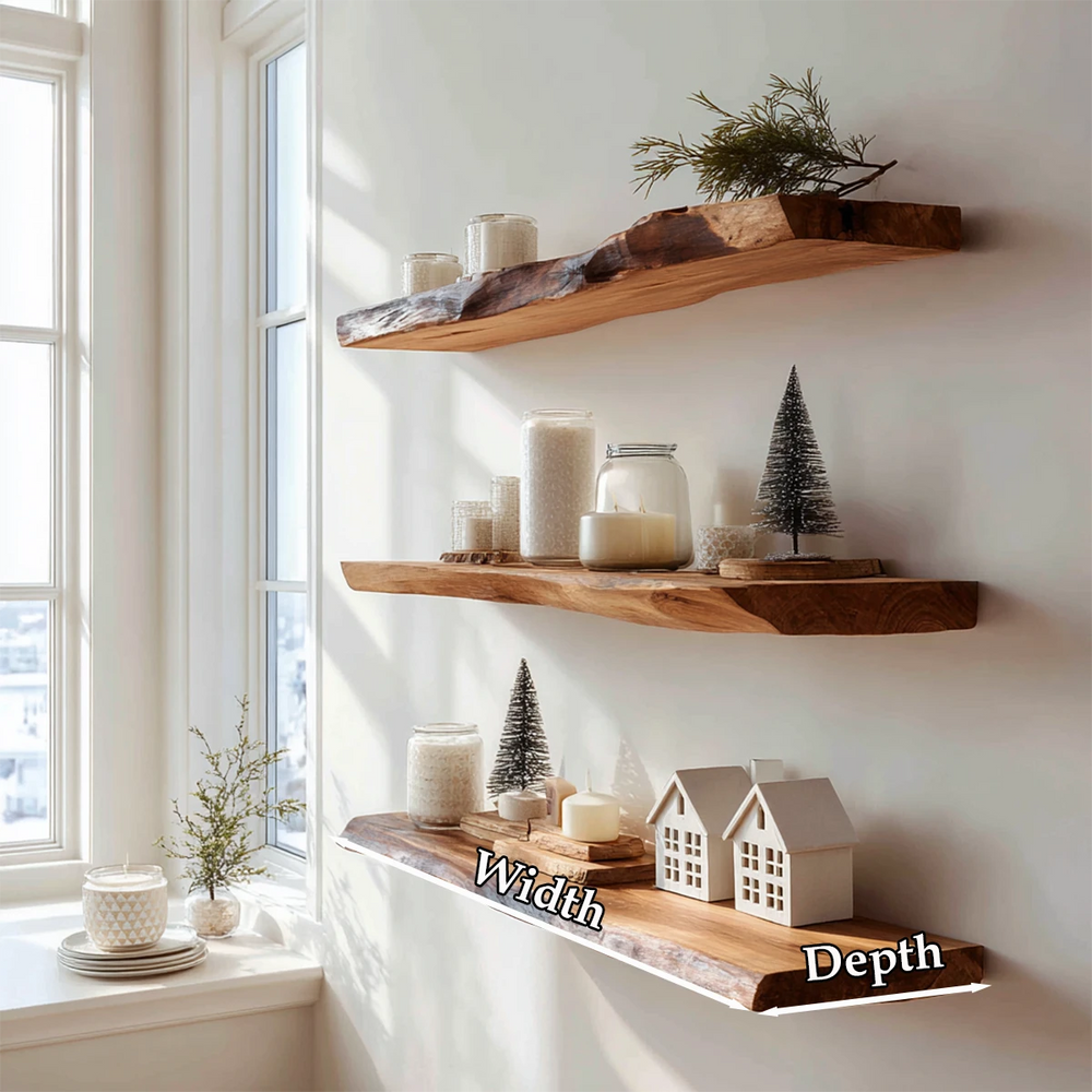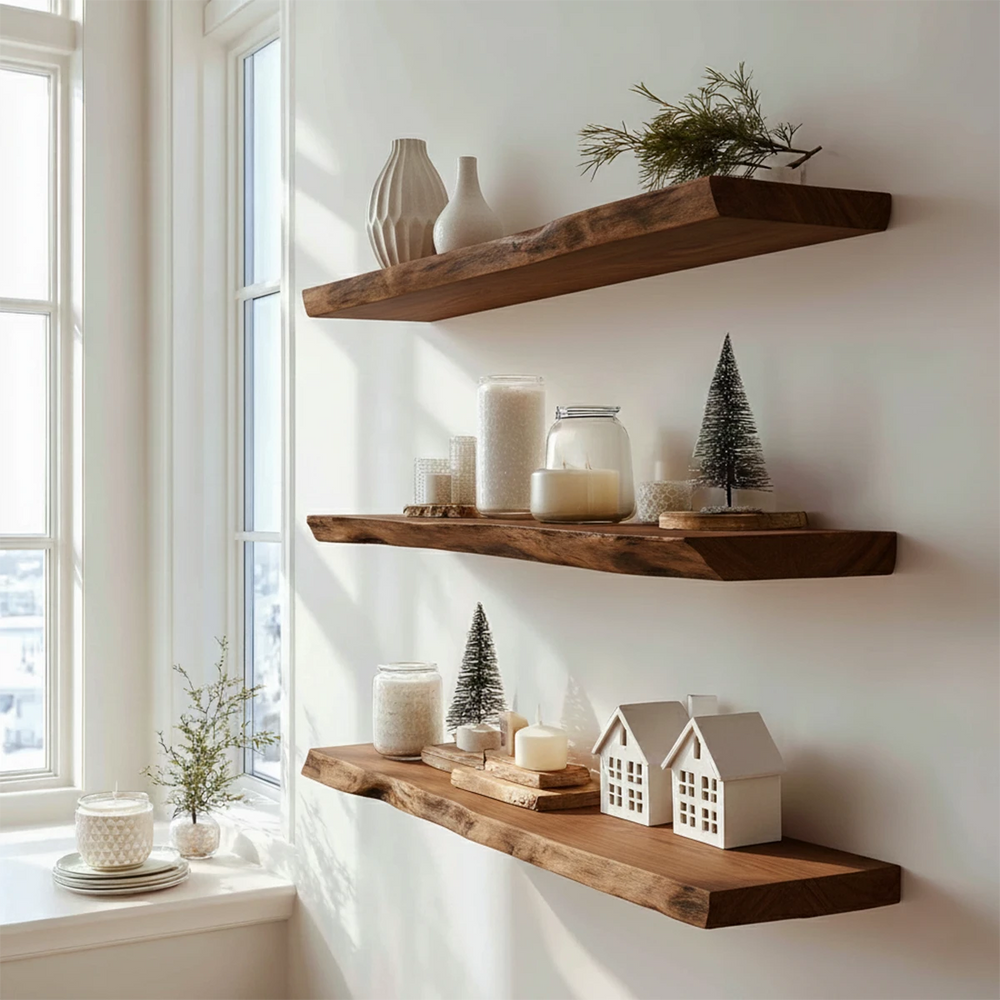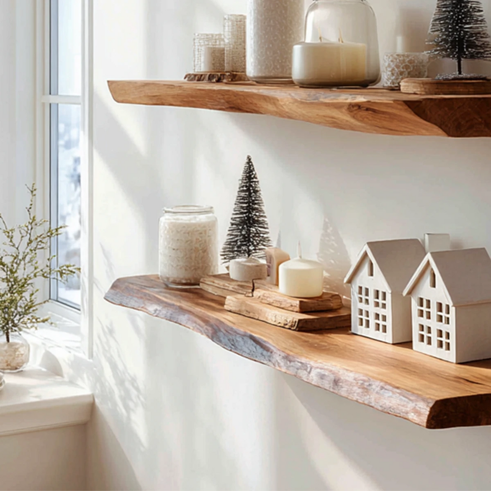 Live Edge Natural Solid Wood Floating Shelves – Minimal Winter Display