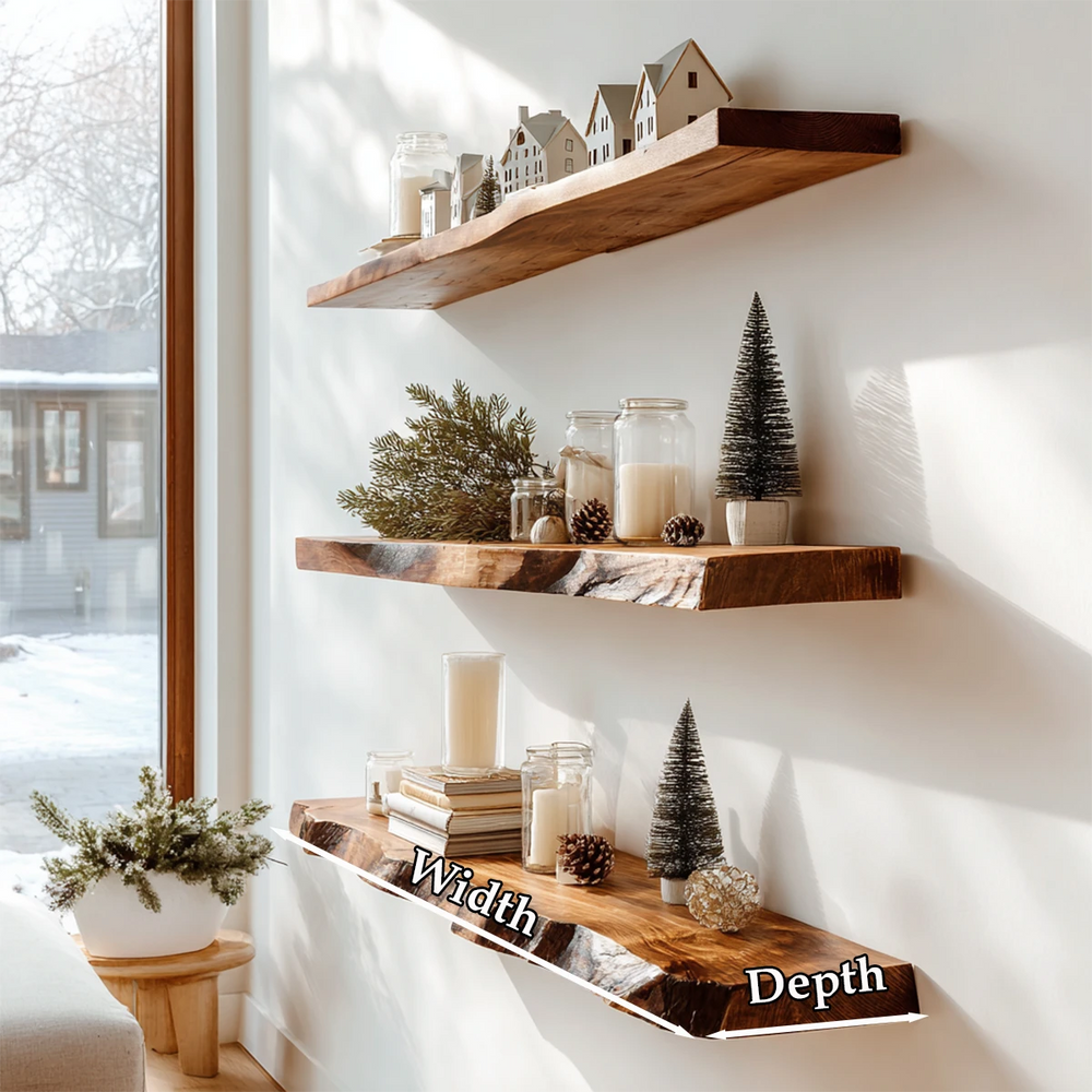 Bathed in soft winter sunlight, these floating shelves bring the calm of nature indoors through their expressive Natural Solid Wood slabs. Each shelf preserves its raw, sculptural live edge—like a quiet landscape carved by time—turning a simple wall into a warm, welcoming focal point.