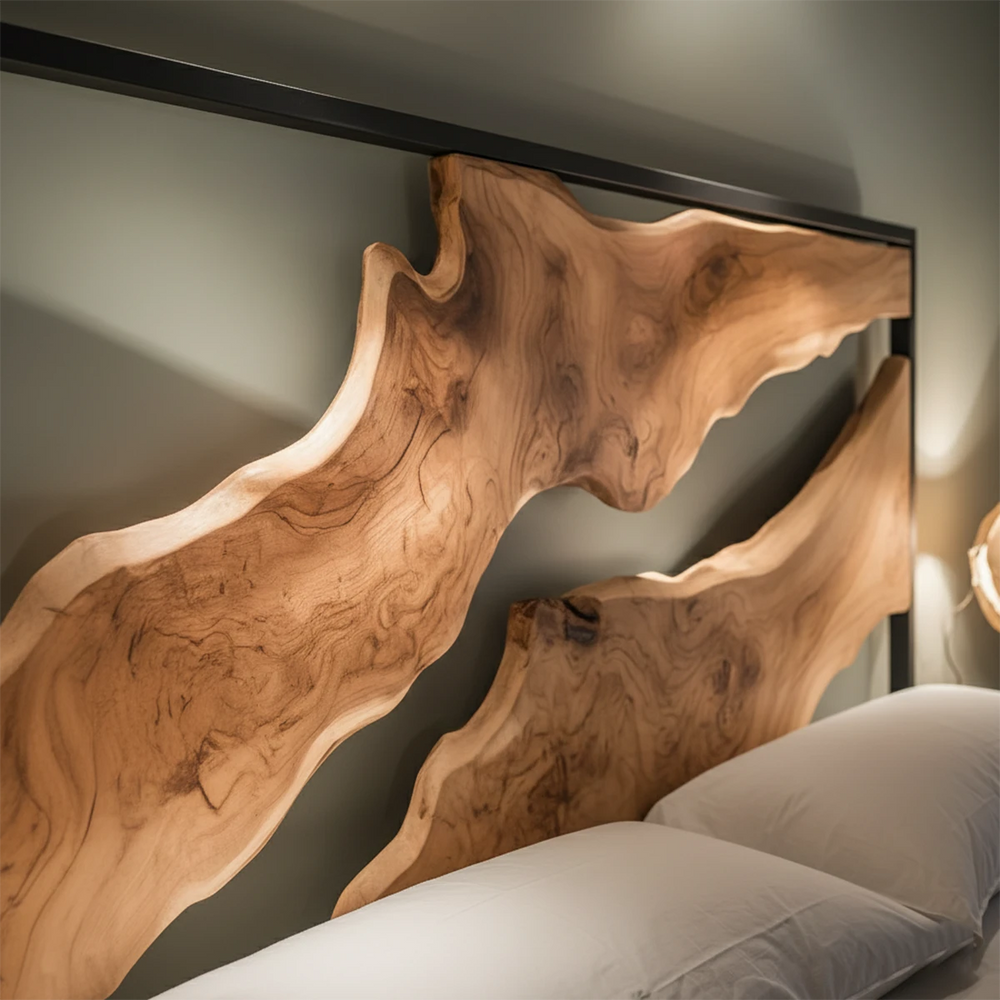 This sculptural Natural Solid Wood headboard brings the raw beauty of nature into the bedroom with dramatic, flowing contours that feel like a landscape carved by time. The live-edge panels float within a sleek structural frame, creating a breathtaking balance between rugged natural artistry and refined modern design.