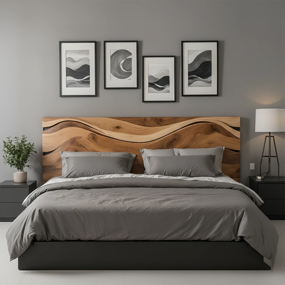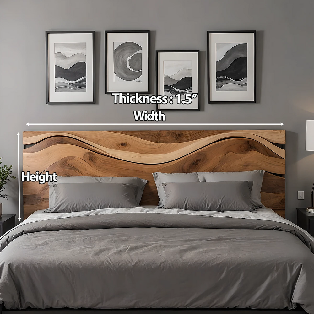 This Natural Solid Wood headboard features a sweeping wave motif that gently flows across its surface, creating an elegant and tranquil visual centerpiece for the bedroom. The design captures the calm rhythm of nature, bringing softness and artistry into a contemporary living space.