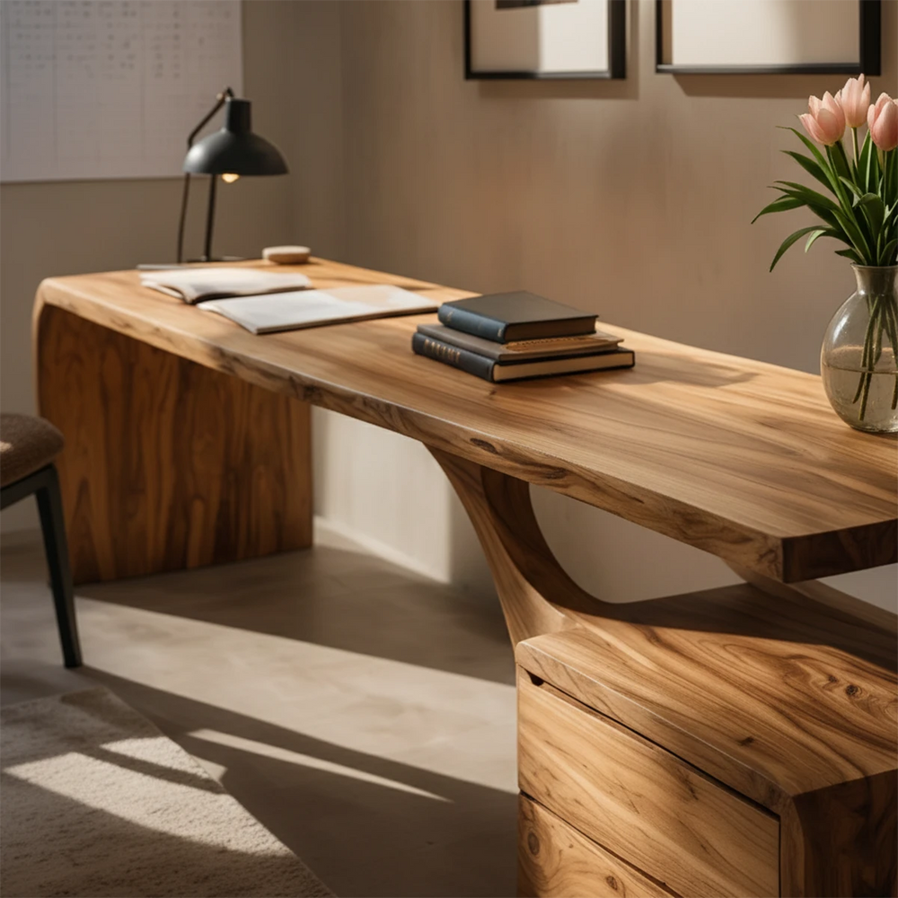 The gentle movement of the grain and the soft curvature of the form cultivate an atmosphere of calm intention. As light shifts across the desk throughout the day, the wood subtly changes tone, creating a grounding workspace that encourages clarity, inspiration, and mindful working habits.