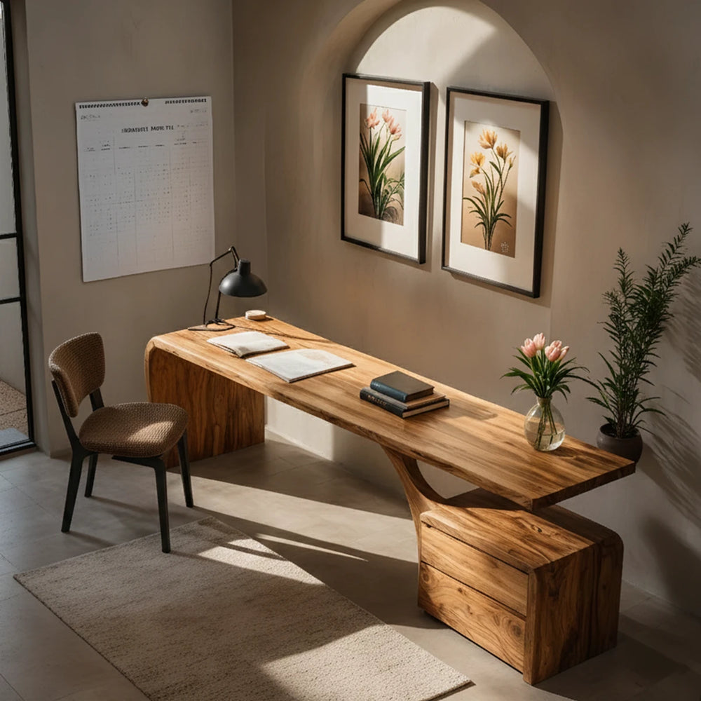 Sculptural Solid Wood Desk with Rustic Curved Base & Storage