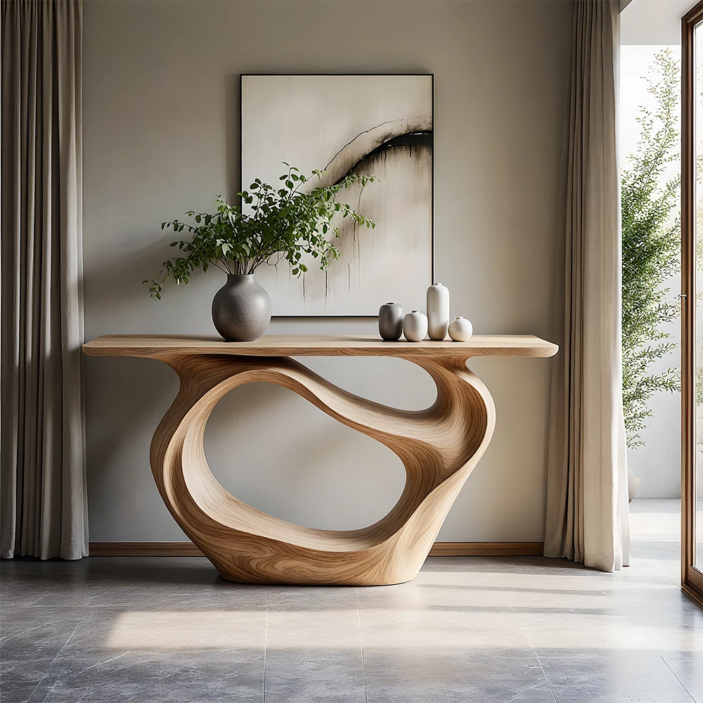 Shaped from Natural Solid Wood, this console embodies the poetic motion of flowing water—smooth, continuous, and gracefully balanced. Its open-loop sculptural form invites light to move through it, turning a simple hallway or living space into an artful, serene environment. Every curve feels organic, echoing the quiet beauty of nature in its purest form.