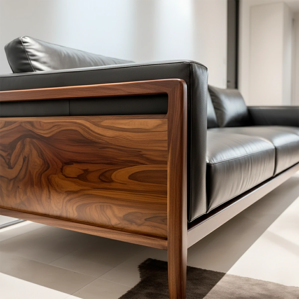 Constructed from Natural Solid Wood with a meticulously hand-finished grain, the frame provides both strength and sculptural beauty. The premium leather cushions offer durability, softness, and long-lasting comfort—each piece shaped with artisan precision.