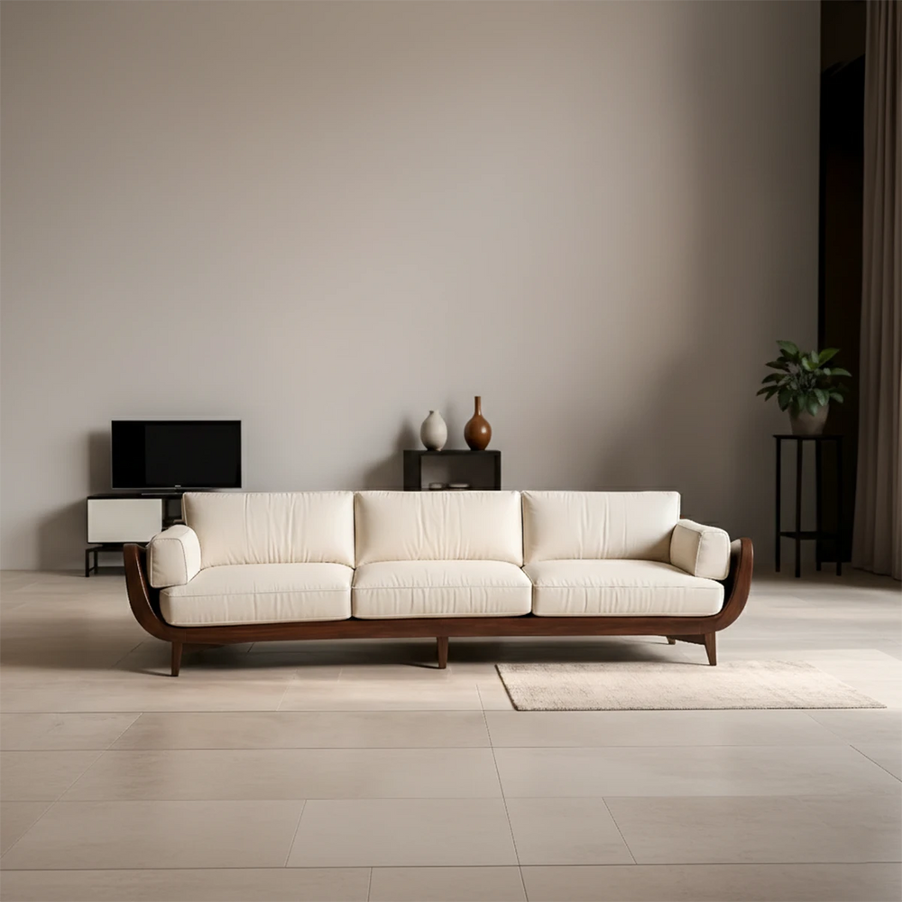 This sofa introduces a refined sense of elegance through the harmony between sculpted wood and soft cotton upholstery. Its gentle curves and warm natural tones bring a quiet sophistication into the room, inviting moments of comfort that feel both elevated and effortlessly serene.