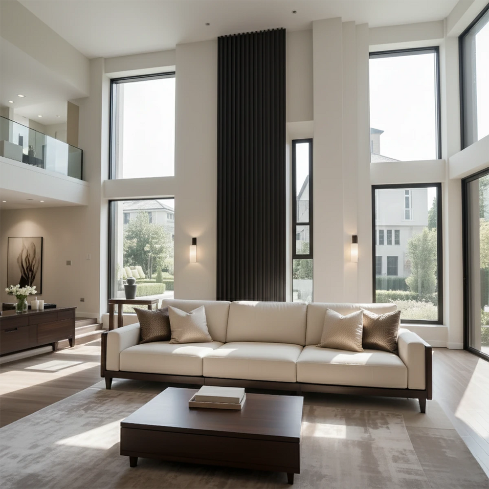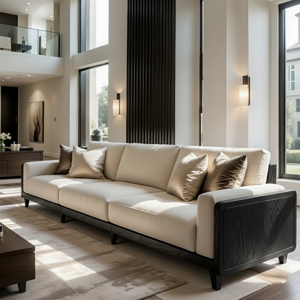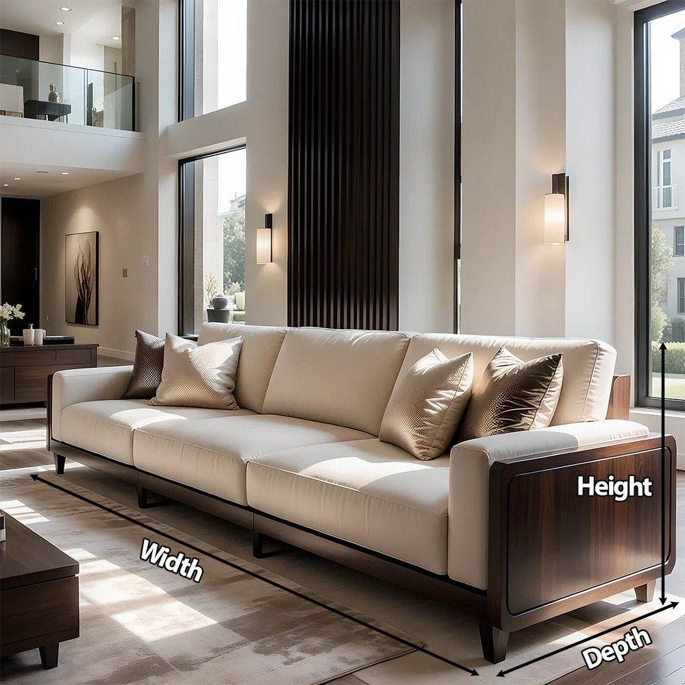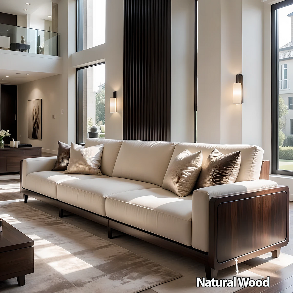 This sofa introduces a serene sense of understated luxury, where soft cream upholstery meets the warm depth of natural wood. It creates a calm, effortless atmosphere — a refined expression of nature interpreted through minimalist artistry.