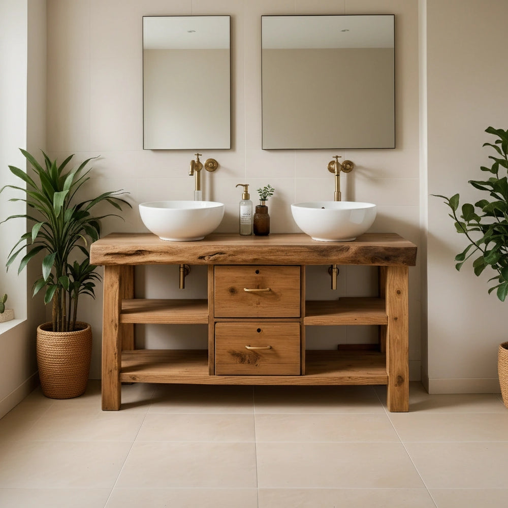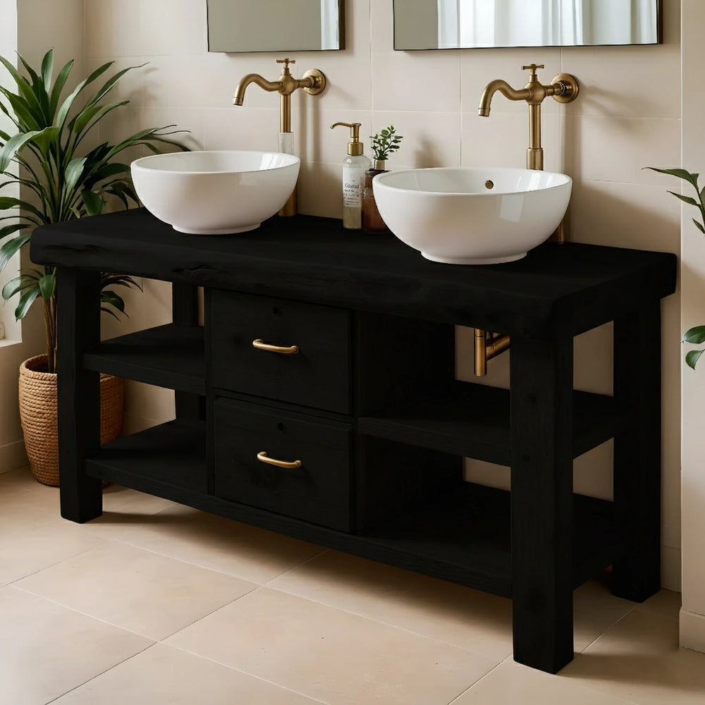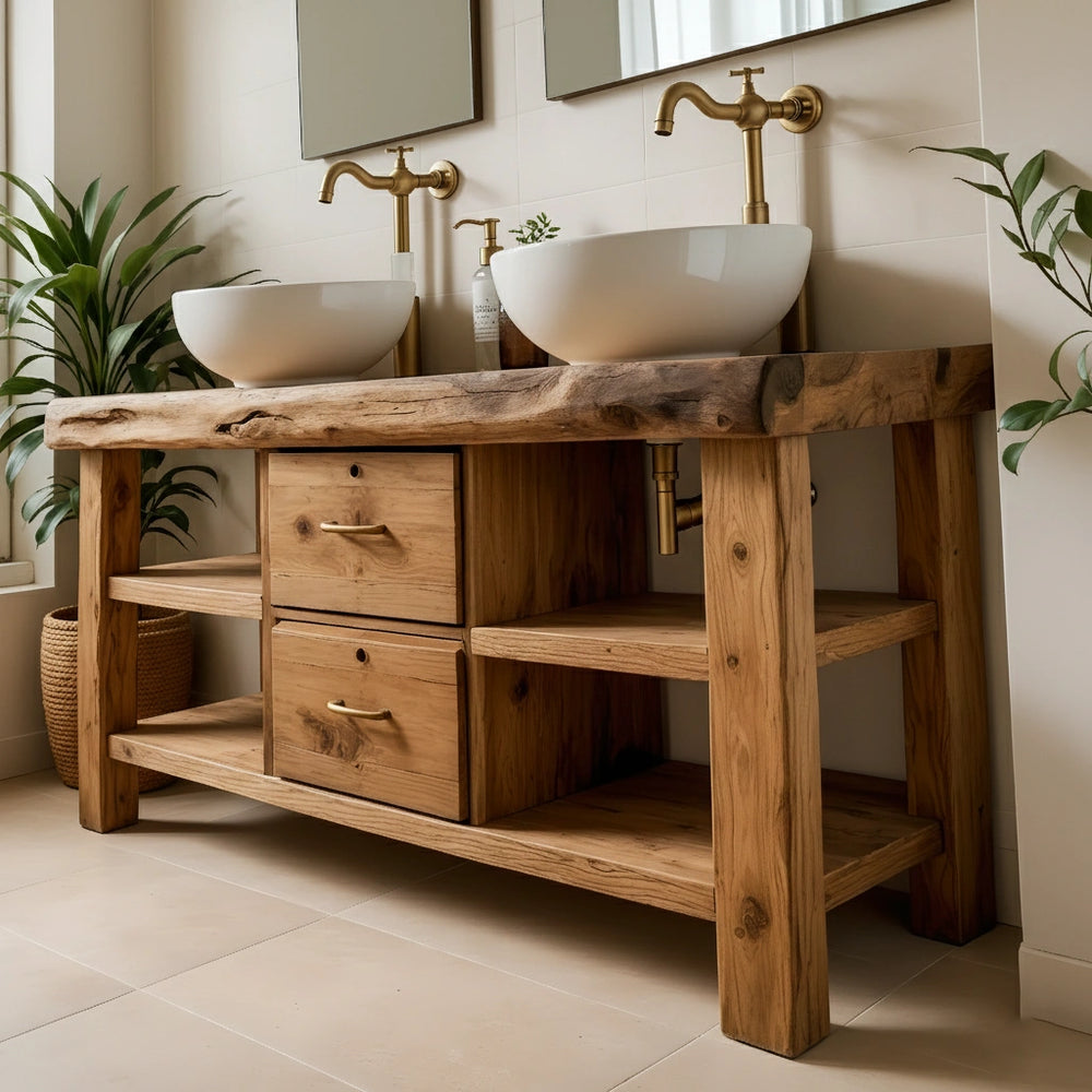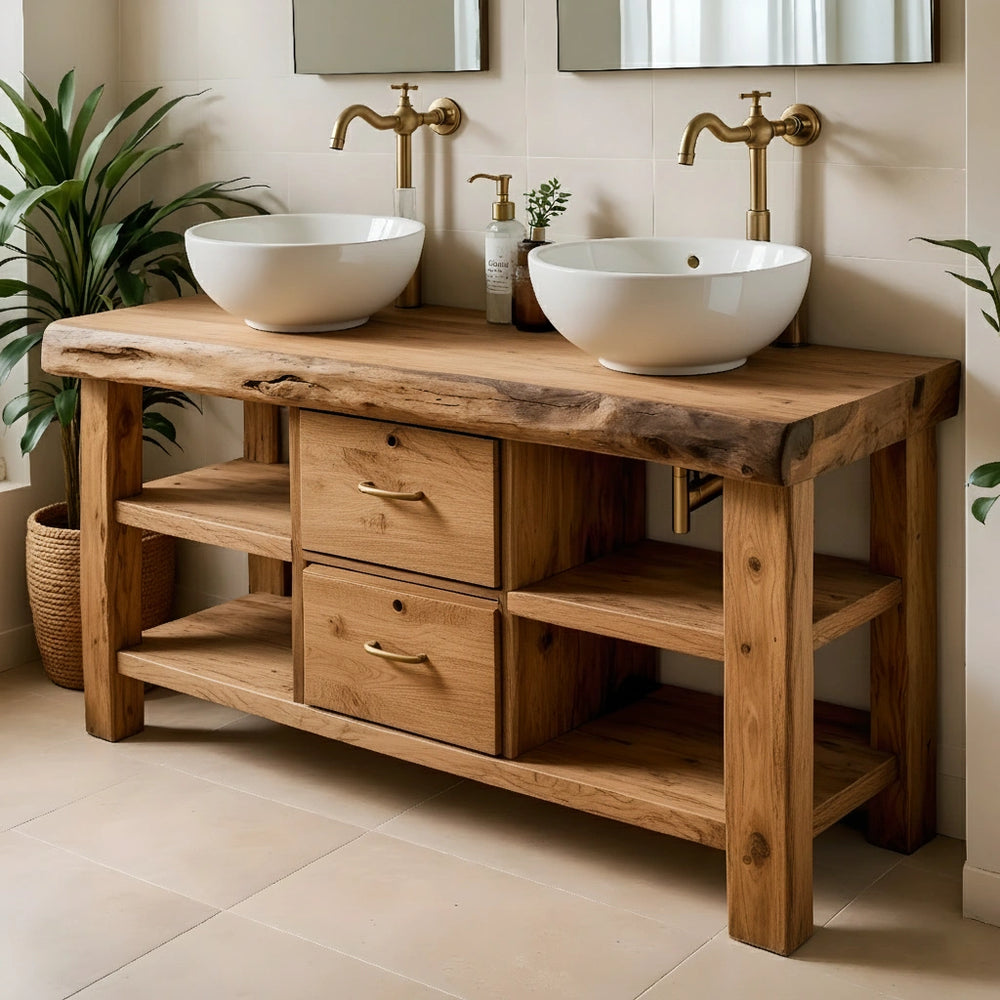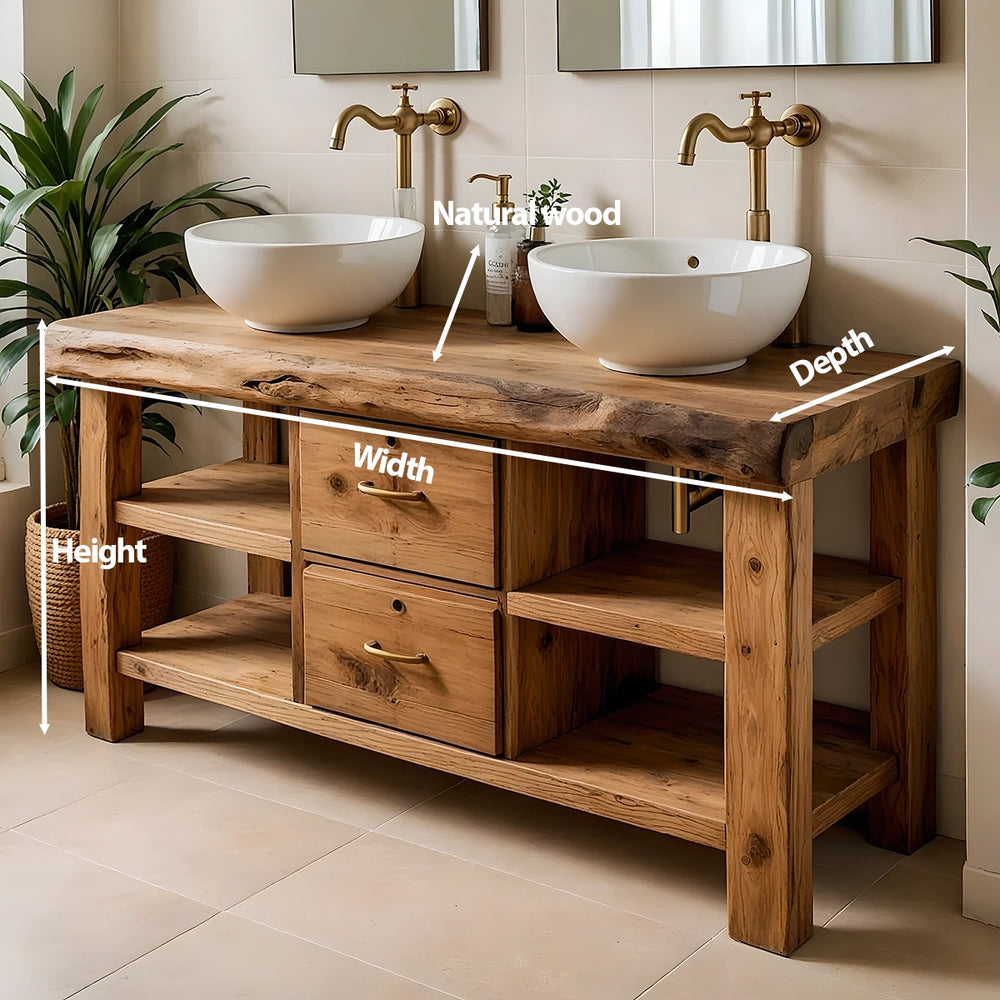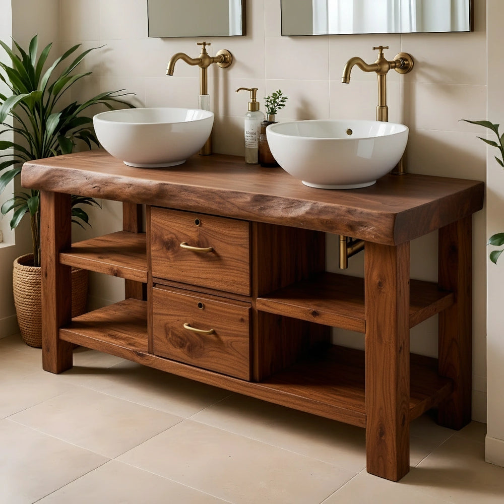 The live-edge top provides a beautifully organic silhouette while maintaining generous usable space for two sinks. Central drawers offer concealed storage, while the open shelves on both sides create accessible compartments for daily essentials. The solid frame and balanced structure deliver both strength and timeless visual harmony.
