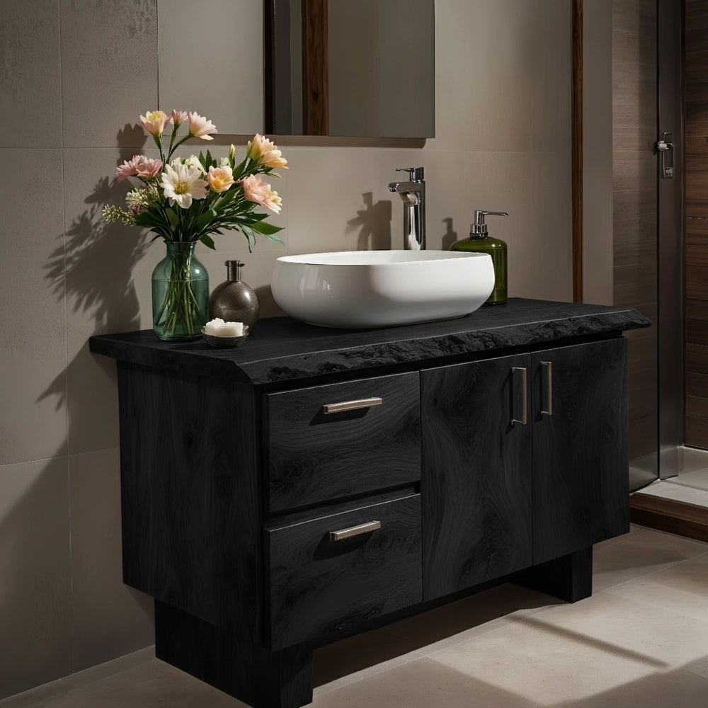 Every surface is refined by hand, from the thick live-edge slab to the precisely joined drawers and doors. The inherent strength of Natural Solid Wood delivers long-lasting stability, resisting moisture-related changes and ensuring durability in daily bathroom environments.