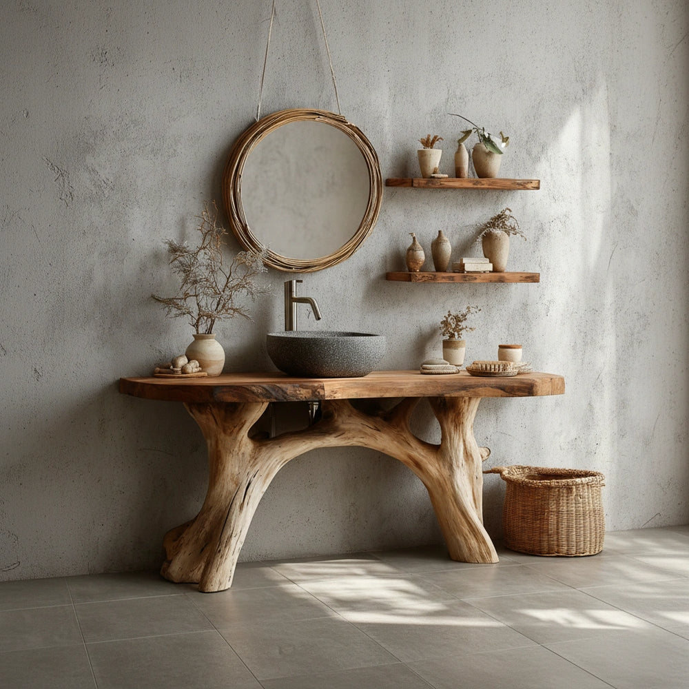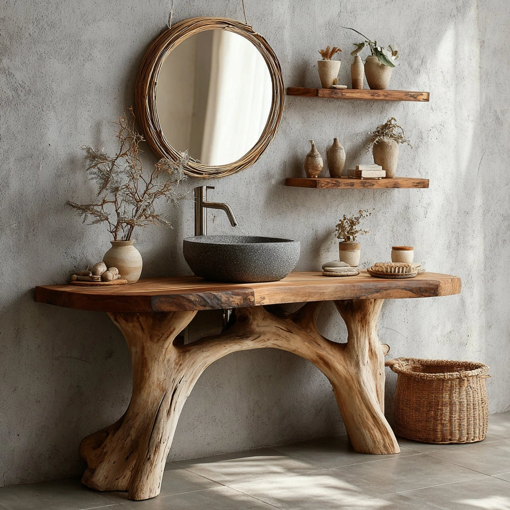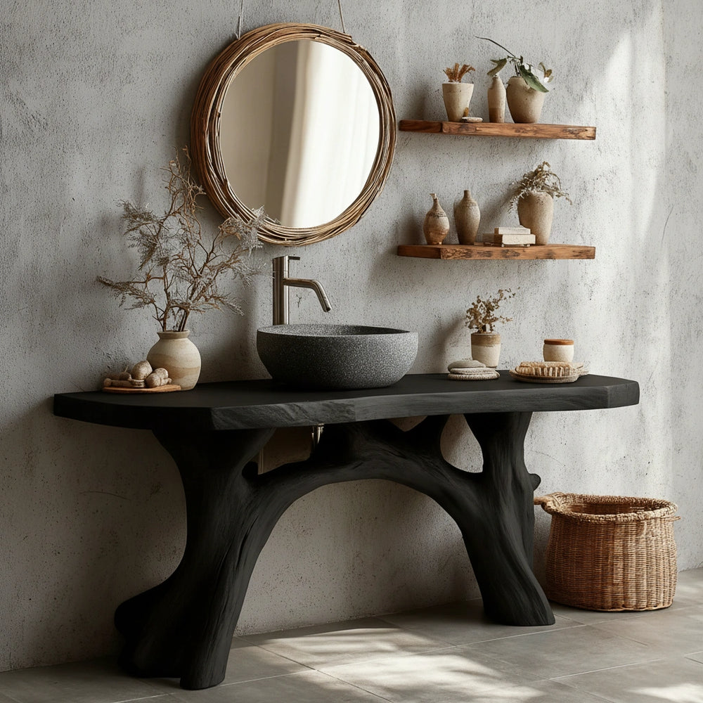 With its branching leg form and substantial live-edge top, the design echoes natural architecture—stable, graceful, and quietly powerful. The open structure allows for practical under-sink clearance while maintaining a sculptural geometry. The vanity fits seamlessly into modern, Japandi, or rustic-luxury spaces, offering both aesthetic depth and everyday usability. Its presence brings warmth and sophistication to bathrooms seeking a distinctive signature feature.