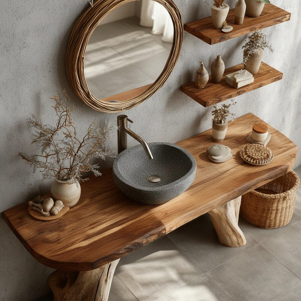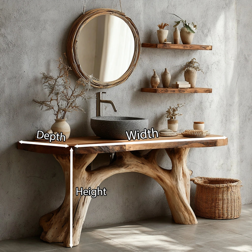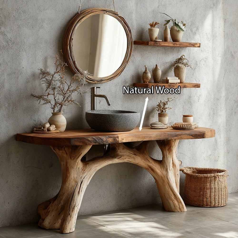 Shaped from Natural Solid Wood with a live-edge silhouette, this vanity brings the quiet strength of raw timber into a calming bathroom setting. Every curve, grain line, and softened contour reflects the passage of nature through time, creating a presence that feels grounded yet elevated. Hand-finished by skilled artisans, the piece becomes a serene focal point that transforms daily rituals into moments of intention.