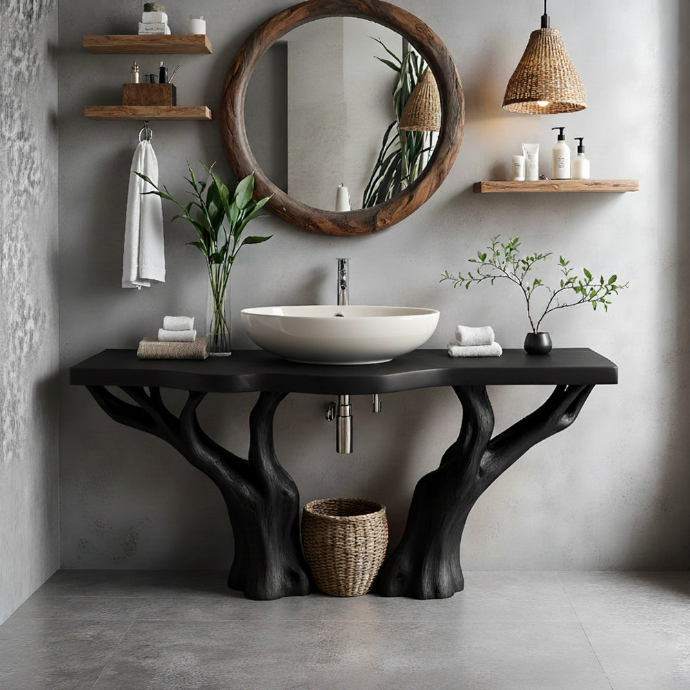 This bathroom vanity is shaped from Natural Solid Wood, celebrating the quiet strength and flowing movement found in nature. Its tree-inspired structure forms a grounded presence, bringing a sense of calm to the space while honoring the hand of the maker. Each curve invites the eye to slow down, creating a functional focal point that enriches the bathing ritual.
