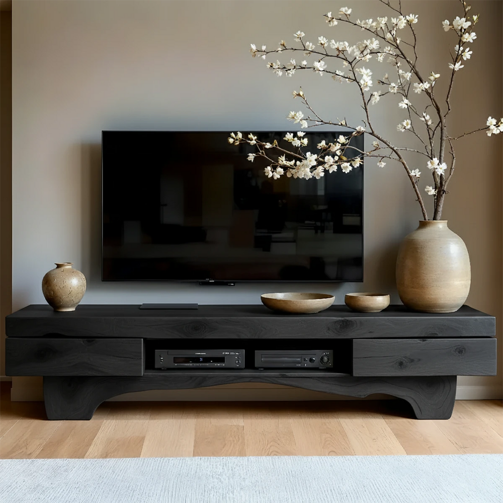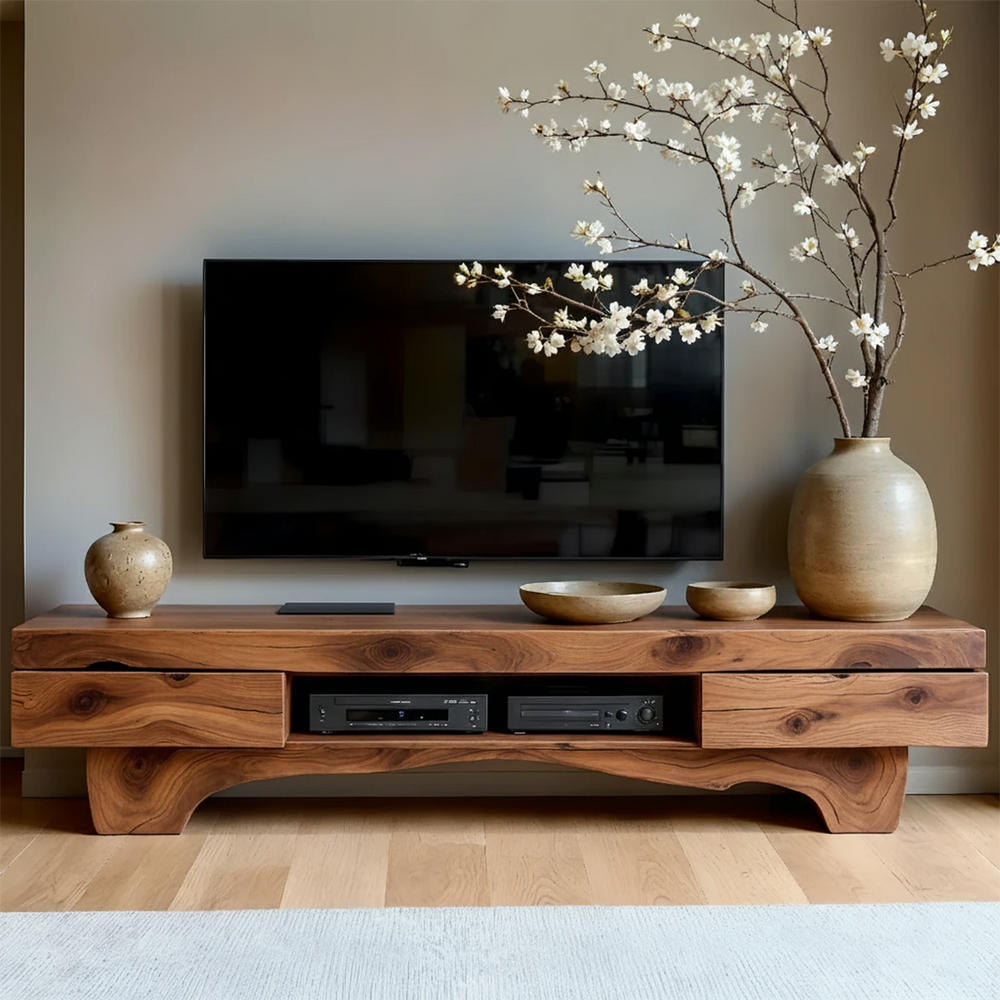 Crafted from Natural Solid Wood, this TV stand reveals flowing grains and expressive knots that echo the poetic softness of wabi sabi furniture. Its sculpted presence brings calm, harmony, and understated luxury to modern living spaces.