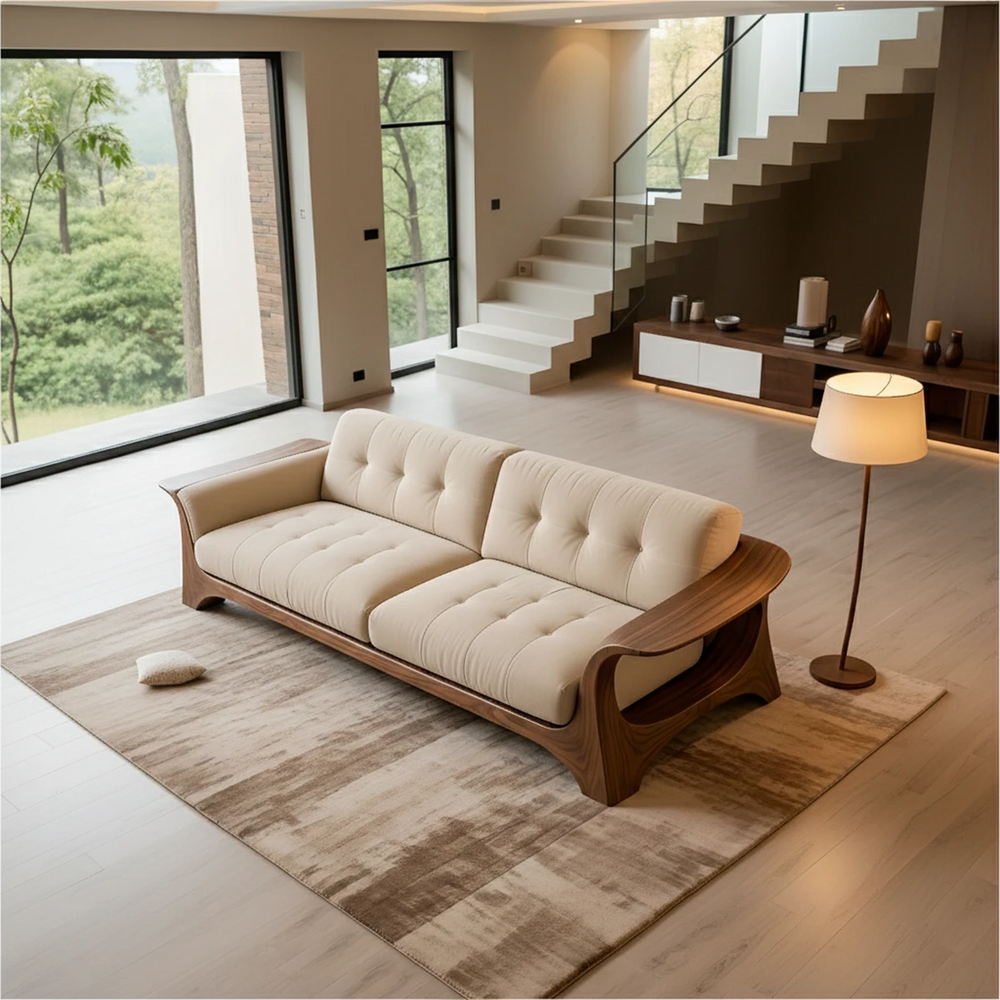 This handcrafted sofa combines a sculptural Natural Solid Wood frame with soft, breathable cotton cushions, showcasing warm organic contours and timeless elegance. Its flowing lines and refined construction make it an inviting centerpiece for modern living spaces.