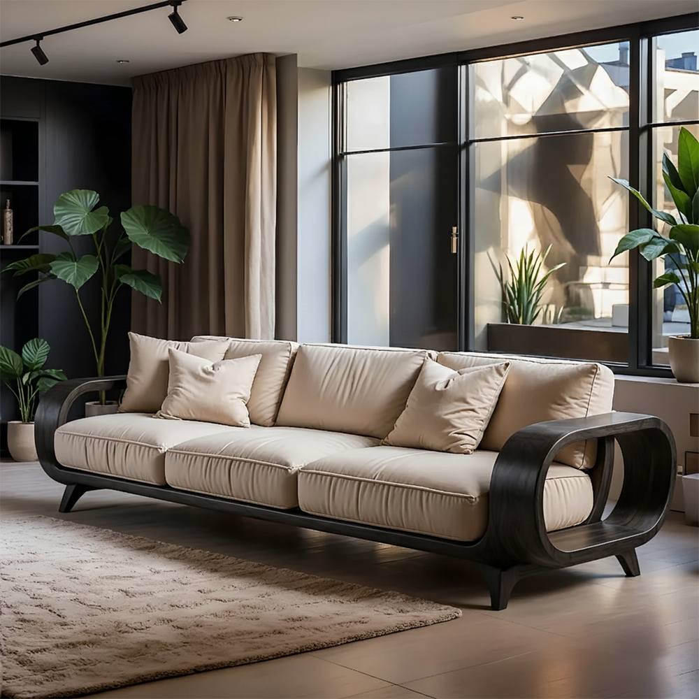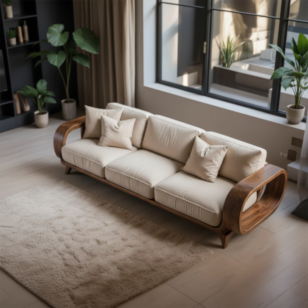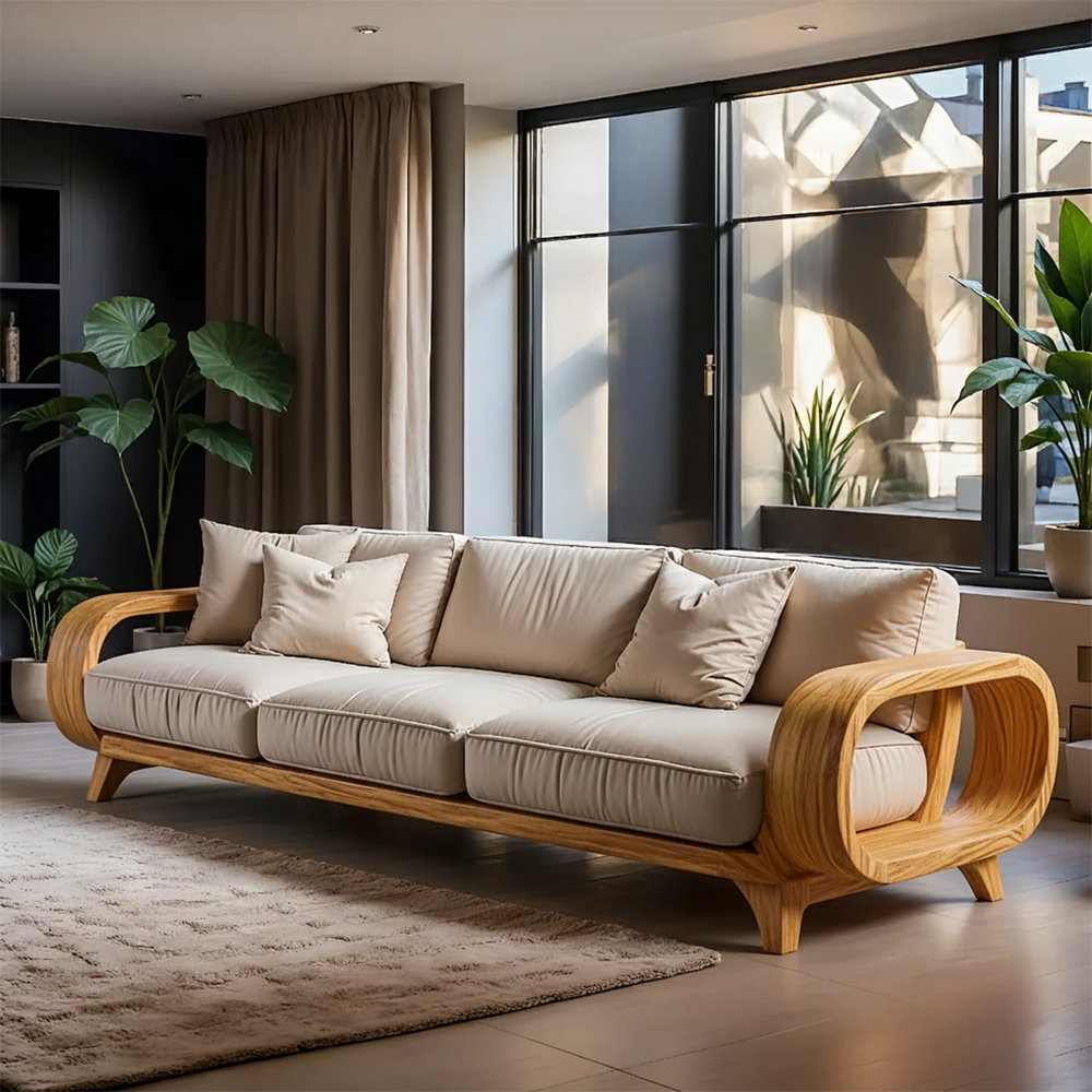 Natural cotton softness and the warmth of solid wood work together to create a serene atmosphere. This sofa turns daily rest into a ritual of comfort, grounding the home with gentle textures and organic shapes.