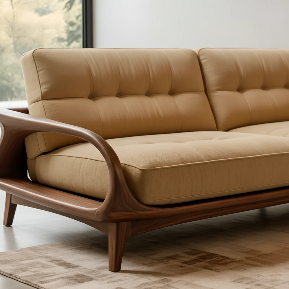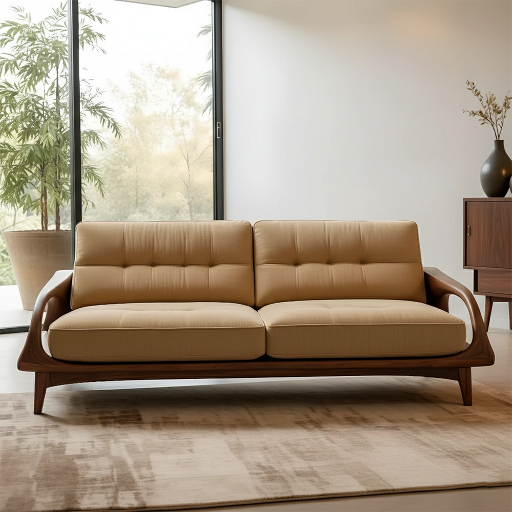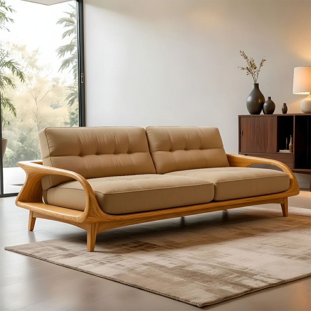 This sofa reflects RustiraWood’s philosophy of peaceful living—where sculpted wooden curves, soft cotton textures, and balanced proportions blend into an elegant, inviting presence. Each detail is shaped to deliver quiet sophistication.