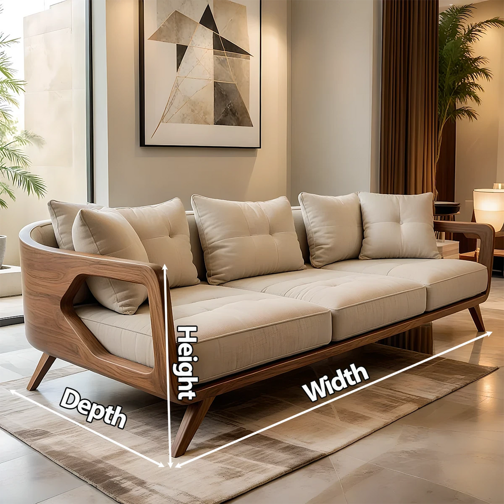The frame is handmade from kiln-dried Natural Solid Wood with precise joinery and soft rounded edges. The cushions are wrapped in natural cotton fabric and filled with high-quality natural fiber padding, offering comfort and durability without synthetic substitutes.