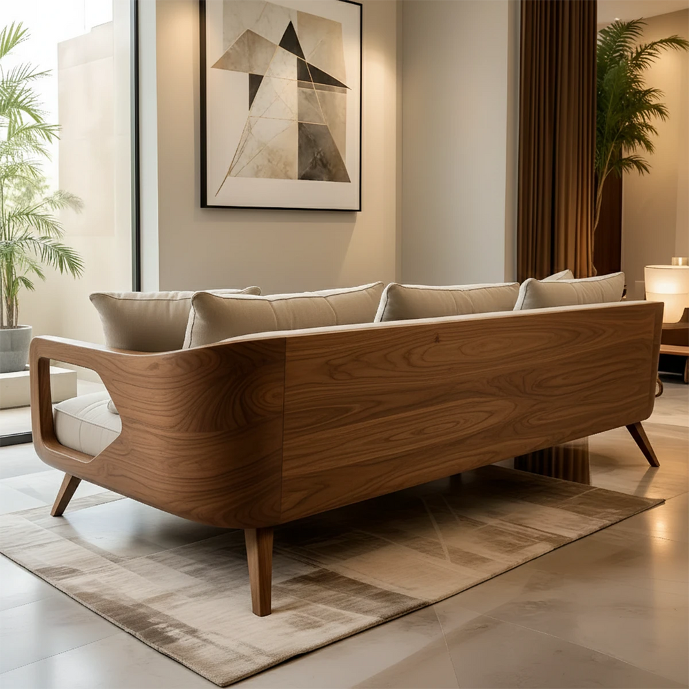 This cotton-upholstered sofa rests on a sculptural Natural Solid Wood frame, showcasing warm grain patterns and smooth organic curves. Its refined silhouette brings a calm, contemporary presence into any living space.