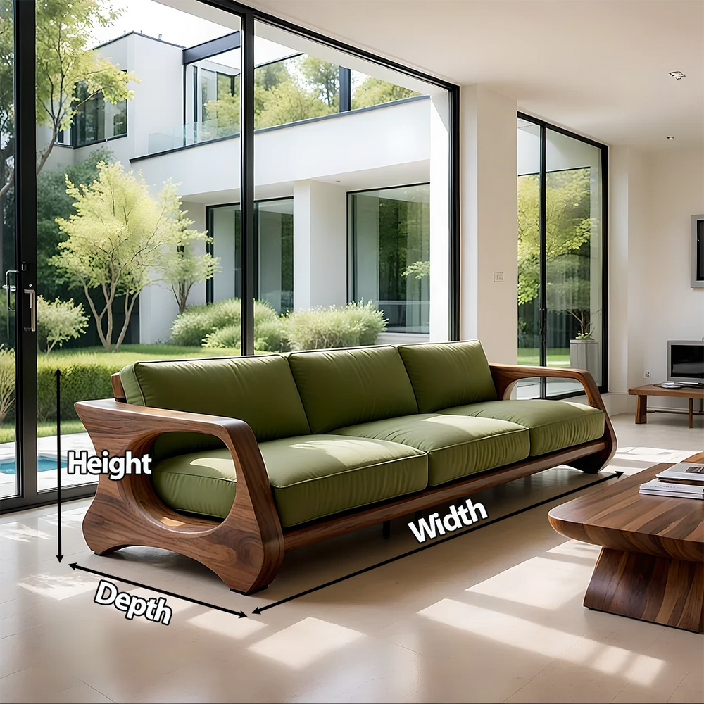 The blend of natural wood warmth and earthy green fabric brings a grounded, nature-inspired atmosphere into your living space. Whether placed by large windows or within minimal interiors, the sofa turns daily moments into a serene living ritual.