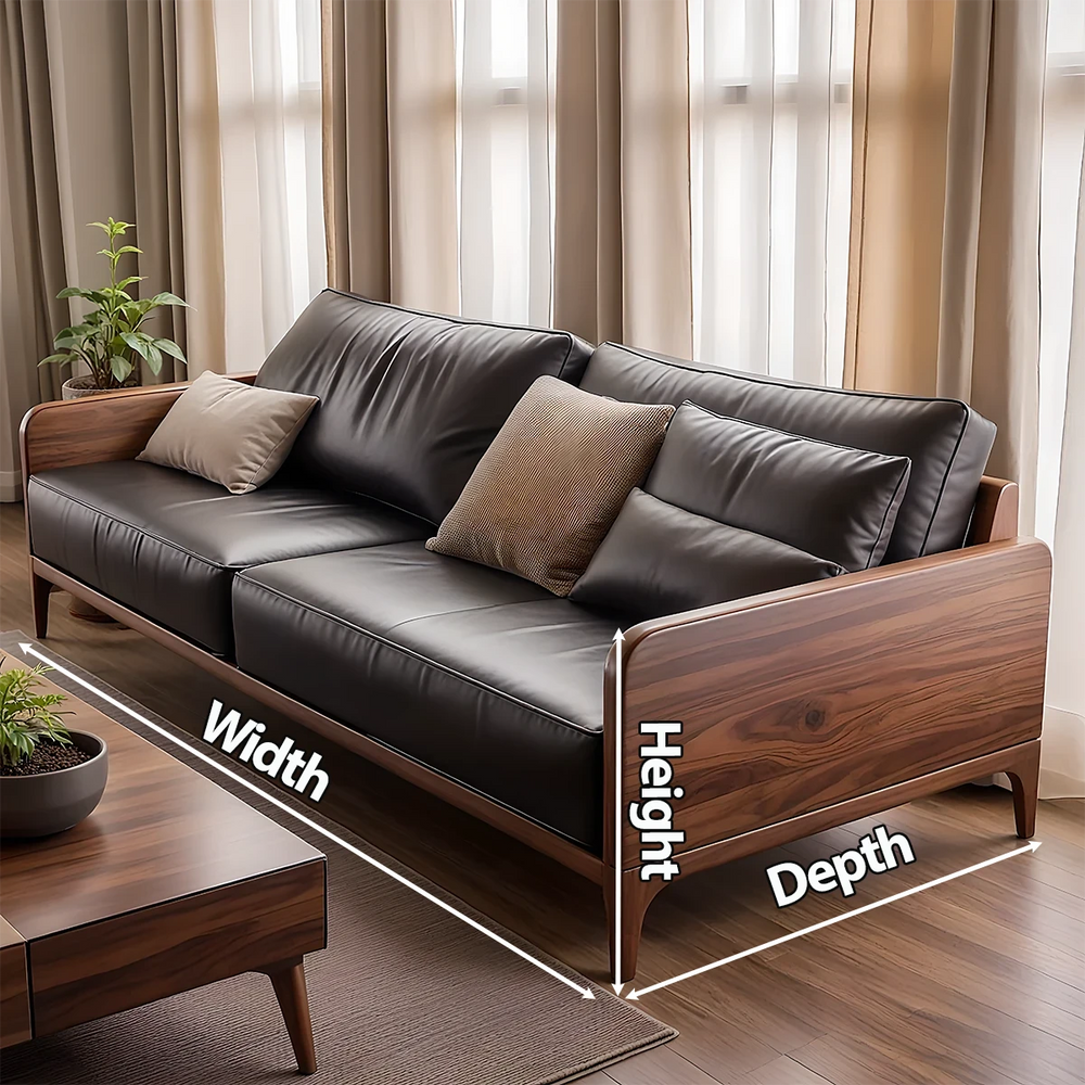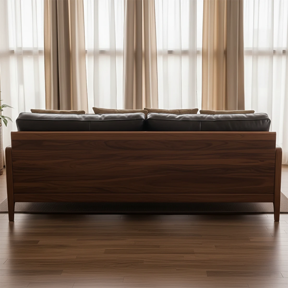 The frame is handcrafted from kiln-dried Natural Solid Wood, shaped with smooth edges and precision joinery. The cushions are upholstered in high-quality leather, paired with natural cotton filling for durability and comfort. Every curve and joint reflects meticulous handmade woodworking.