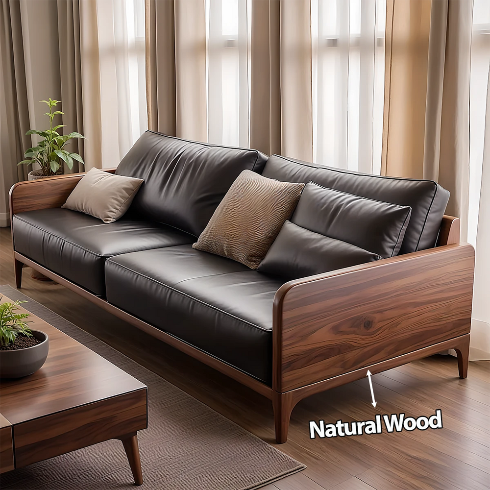 This premium leather sofa is built upon a sculptural Natural Solid Wood frame, highlighting expressive grain patterns and warm organic contours. The clean, modern form elevates the living space with a refined presence rooted in true craftsmanship.