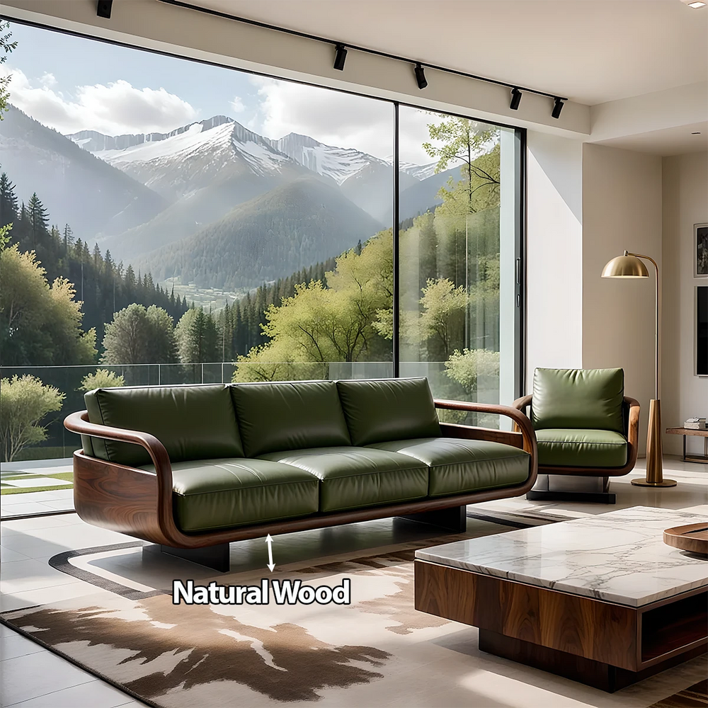 Embodying the quiet luxury of modern organic living, this handcrafted sofa blends sculptural Natural Solid Wood with premium leather upholstery. Each curve, joint, and silhouette is shaped to honor the warmth of natural materials while delivering a refined presence that transforms any interior.