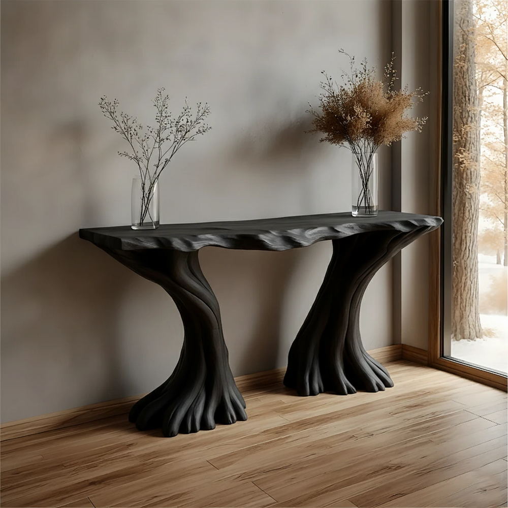 The dual-root foundation offers a visually balanced silhouette while providing excellent stability. Its elongated top is perfect for hallways, entryways, and open living spaces—ideal for candles, ceramics, seasonal florals, or minimalist décor. The design blends Japandi, Wabi-Sabi, and Organic Modern aesthetics, allowing it to serve both as functional furniture and as an art piece.