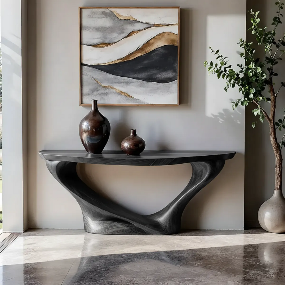 This console table is defined by a continuous wave-form base carved into a seamless, flowing silhouette. The design curves inward and outward in a soft rhythmic motion, creating a sculptural presence that anchors the room without overwhelming it. Its balanced form brings a sense of quiet luxury, ideal for interiors seeking organic elegance and modern refinement.