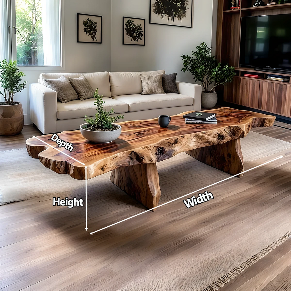 Carved from a single slab of Natural Solid Wood, this live-edge coffee table celebrates the raw poetry of nature—flowing edges, rich grain movement, and organic formations that make each piece inherently one-of-a-kind. Its bold natural silhouette anchors any space with quiet sophistication.
