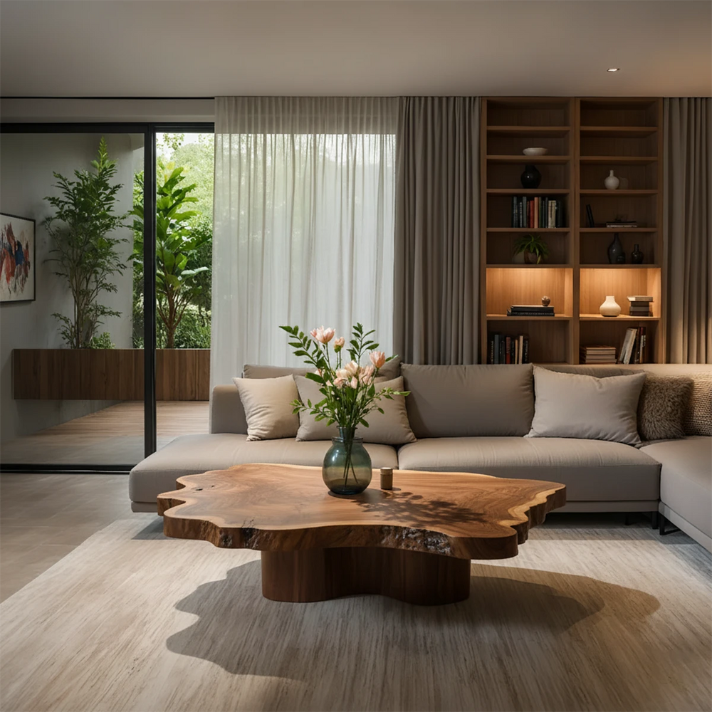 Bold yet effortlessly calming, this natural-edge coffee table celebrates the expressive beauty of Natural Solid Wood. Every curve, knot, and grain pattern forms a sculptural presence that anchors the living space with quiet sophistication. Designed as a centerpiece, it offers a warm, inviting atmosphere while maintaining a distinctly Japandi and Modern Luxury character.