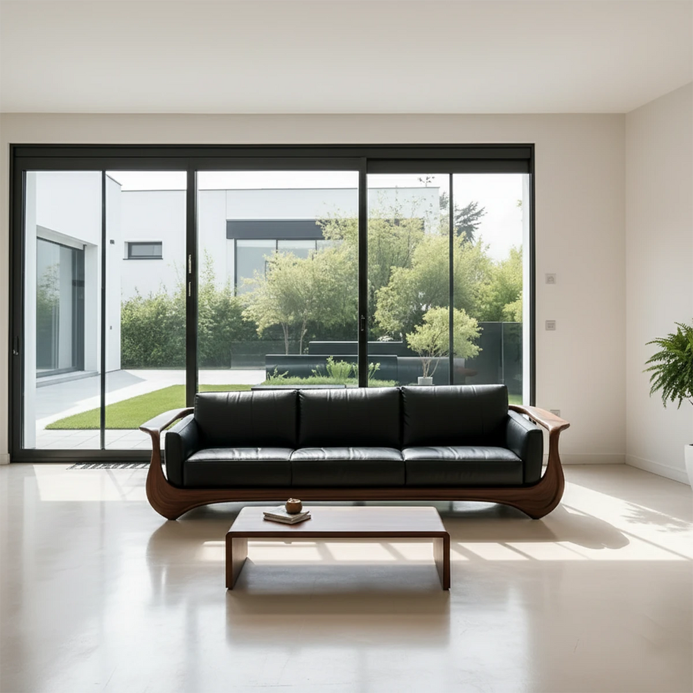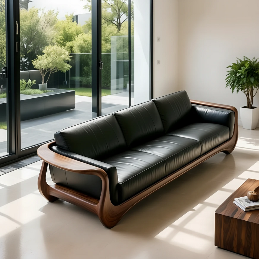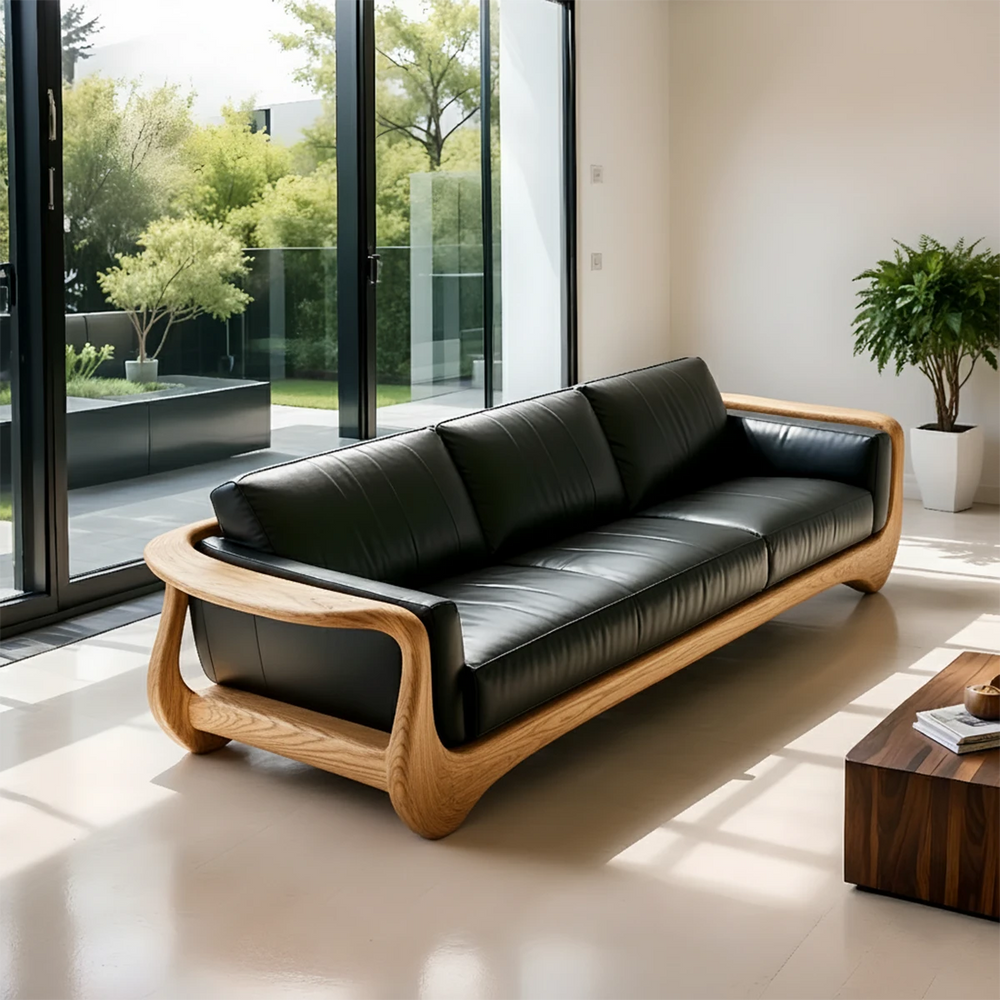 This premium leather sofa embodies RustiraWood’s philosophy of sculpting natural materials into flowing organic forms. The deep black leather rests elegantly within a hand-shaped Natural Solid Wood frame, creating a bold balance of softness and structure.