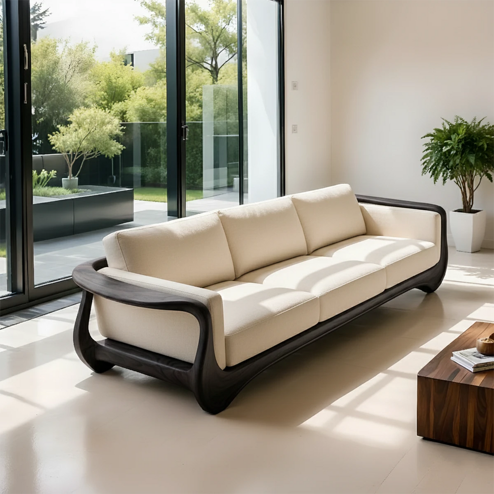 The continuous arc of the wood frame blends seamlessly into the armrest and base, giving the sofa a striking silhouette rooted in organic modern design. The cushioned seating provides firm yet comfortable support—ideal for long hours of use without sacrificing posture or style.