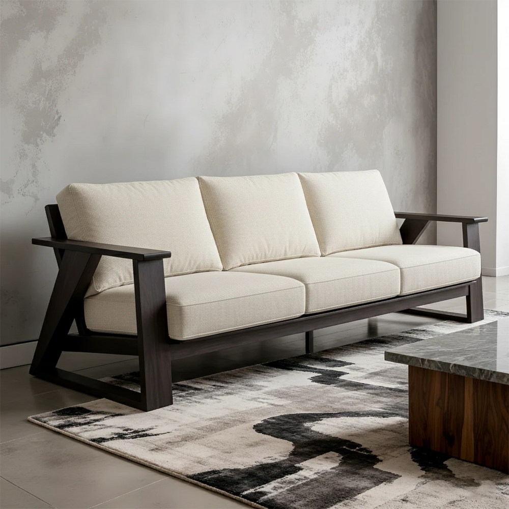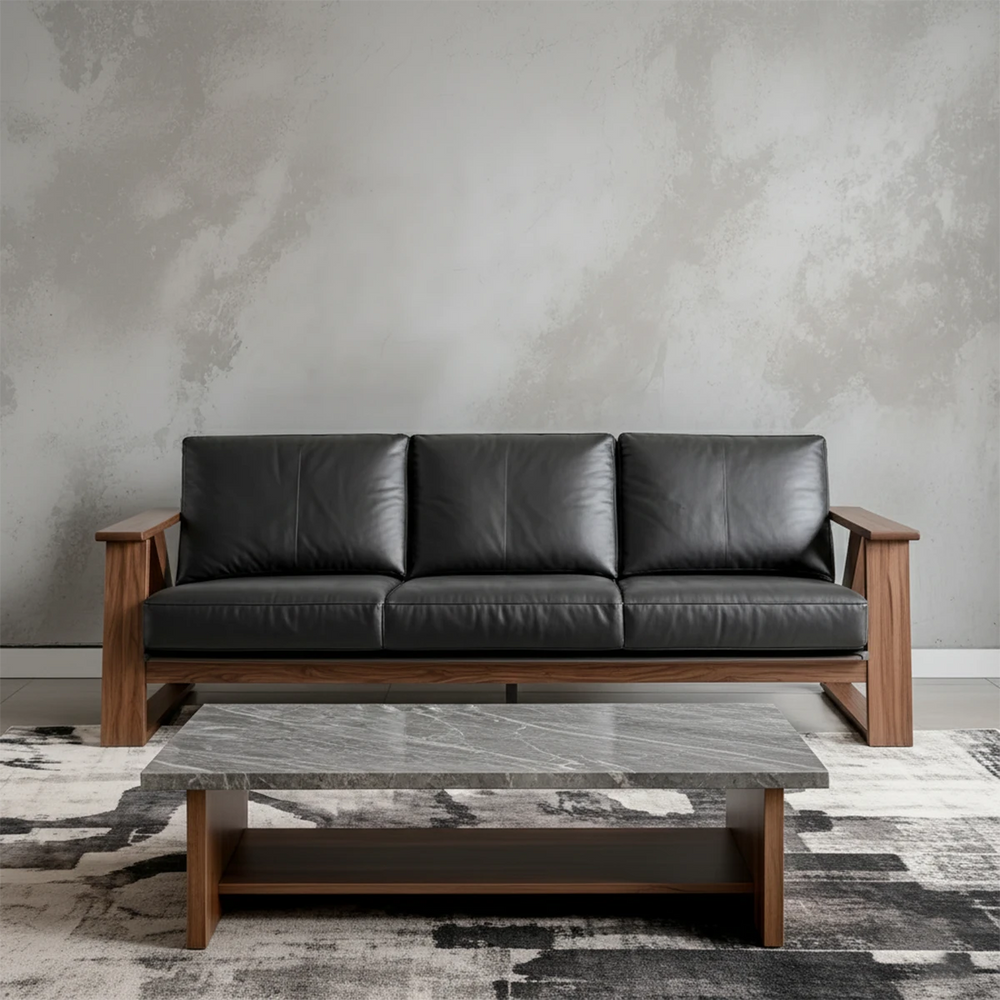This sofa brings together modern geometry and refined materiality, featuring a bold Z-shaped frame handcrafted from Natural Solid Wood. The deep black leather cushions introduce a sophisticated contrast, creating a centerpiece that feels both architectural and organic.