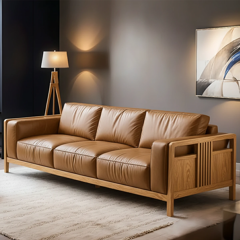 This handcrafted leather sofa is anchored by a refined Natural Solid Wood frame, showcasing warm natural grain patterns and modern structural lines. The smooth leather cushions introduce a sophisticated tone, creating a balanced, contemporary presence in any interior.